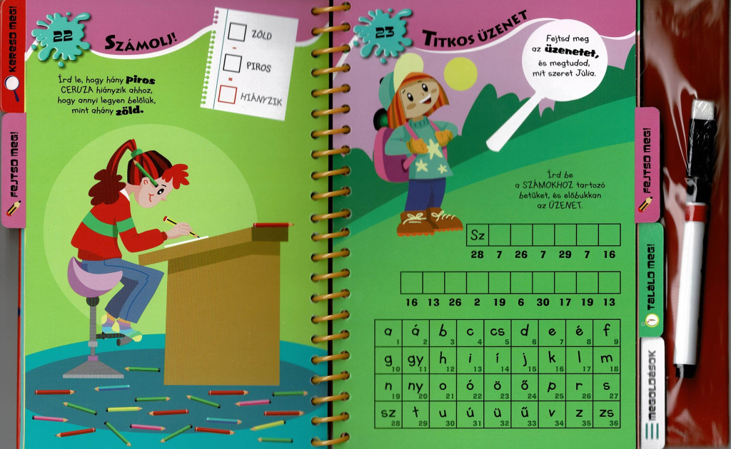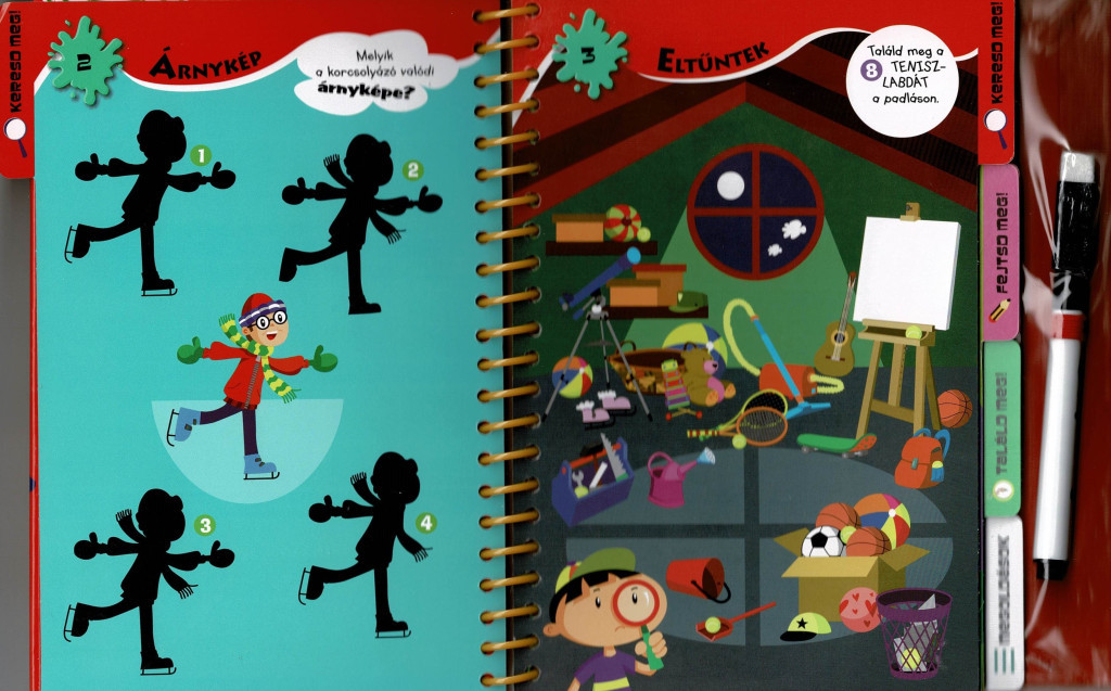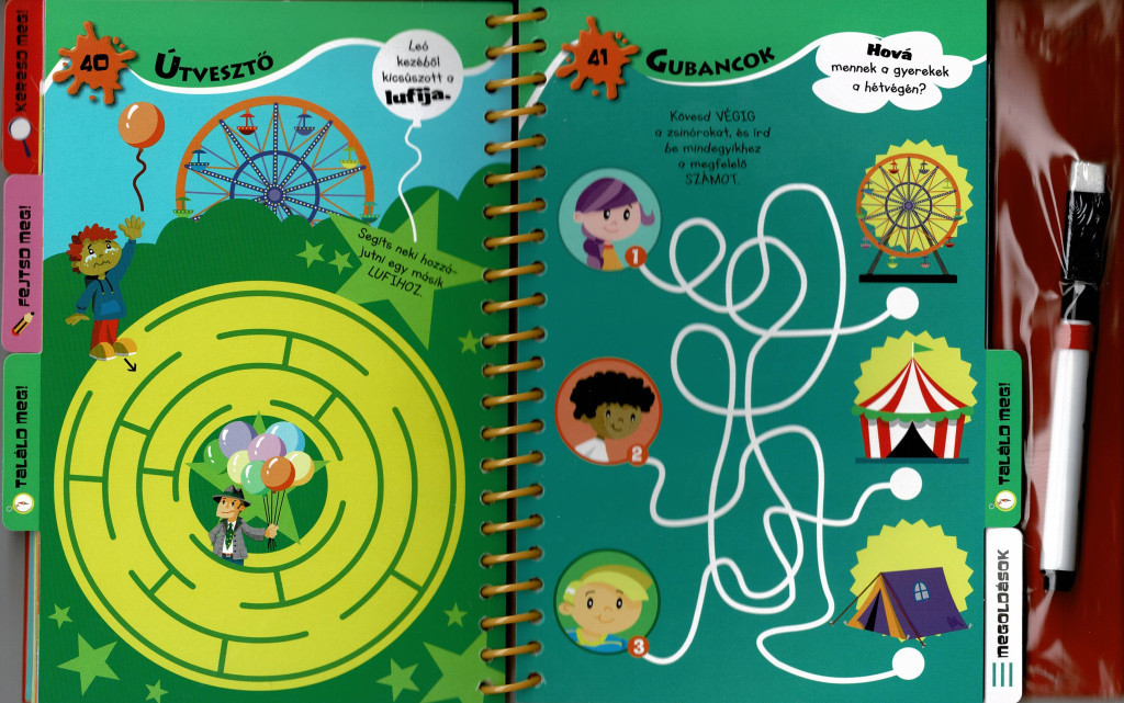 A mellékelt letörölhető toll felszabadítja a próbálkozásokat: nem baj, ha elsőre nem sikerül, a jelölések egyszerűen eltüntethetők, és jöhet az új megközelítés. Ez a formátum természetes keretet ad az önellenőrzésnek és az önbizalom építésének: a gyerekek megtapasztalják, hogy a tévedés a tanulási folyamat része, a javítás pedig kézzelfogható. A feladatoldalak időtartama rugalmas: van, amelyik egy-két perc alatt megoldható, és akadnak elmélyültebb koncentrációt igénylő rejtvények is – így a kötet jól illeszthető a család mindennapjaihoz.