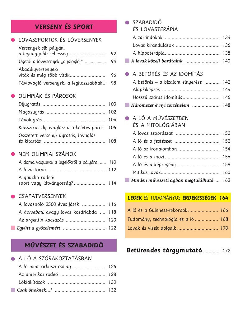 A LOVAKAT MINDENKI SZERETI, hiszen csodálatos társak munkában és szórakozásban egyaránt. Enciklopédiánkban elsősorban az emberrel közös útját tekintjük át a sport, a film, a háborúk, a mitológia szempontjából. Felvonulnak előttünk a leghíresebb lovak, ámulhatunk hűségükön és megbízhatóságukon, és megérthetjük belőle, mi mindent köszönhet az emberiség ezeknek a nagyszerű állatoknak.