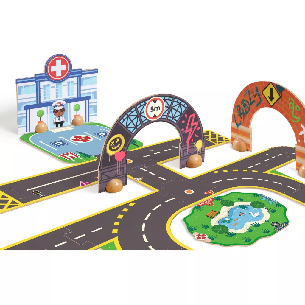Építsd meg saját óriás városodat ezzel a különleges PUZZL'UP városi pályával, amely a puzzle játék és az autós kalandok izgalmas kombinációja. A padlón összeállítható úthálózatot 3D-s épületek teszik még látványosabbá, így a gyerekek valódi városi környezetben játszhatnak autóikkal.