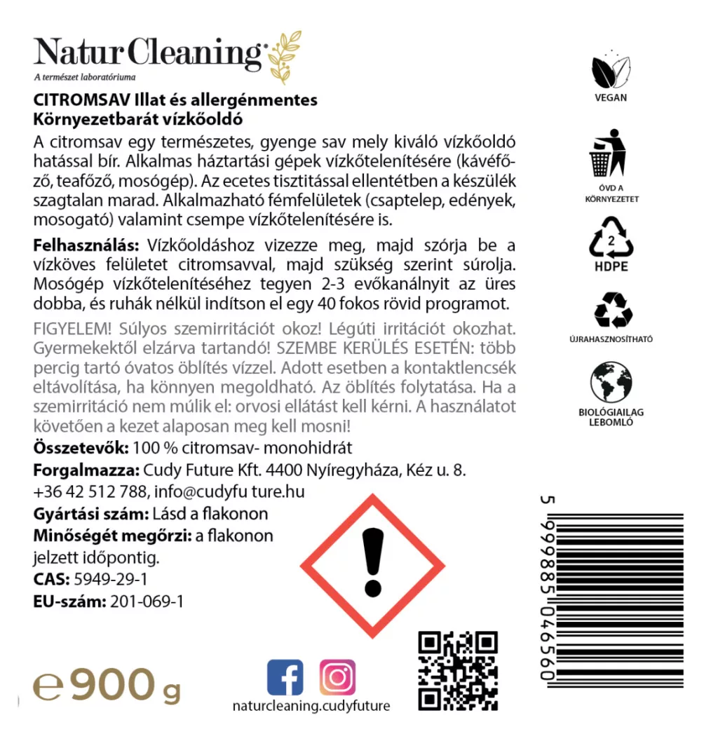 Citromsav alapú környezetbarát vízkőoldó – hatékony, mégis kíméletes alternatíva a hagyományos vegyszerek helyett. Szagtalan, vegán, és tökéletes választás, ha nem szeretnél többé kompromisszumot kötni a tisztaság és a környezettudatosság között. Legyen szó kávéfőzőről, vízforralóról vagy mosógépről, ez a citromsav új életet lehel háztartási gépeidbe.