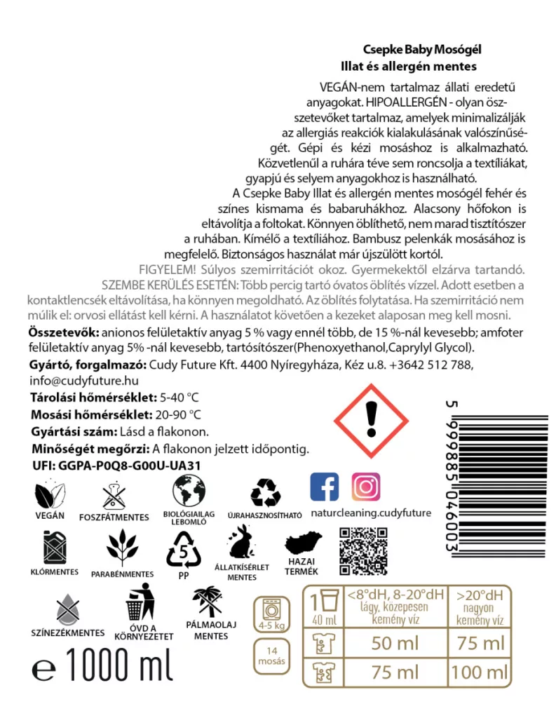 A Csepke Baby mosógél a legkisebbek igényeire szabva készült – illat- és allergénmentes formulájának köszönhetően már újszülöttkortól biztonságosan használható. Kíméletes, mégis hatékony tisztítást nyújt fehér és színes babaruhákhoz, mosható pelenkákhoz, sőt, kismamaruhákhoz is.