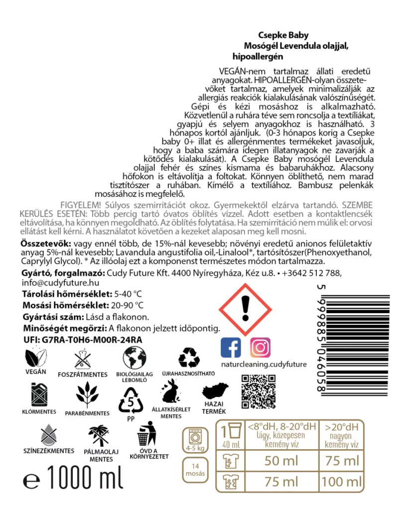 A természetes levendula illóolajjal készült mosószer ideális választás a nyugtalanabb, érzékenyebb babák számára. Kíméletesen tisztítja a család, a baba és a kismama ruháit, miközben a levendula természetes nyugtató hatása segíthet ellazulni – már az öltözködés pillanatától. Vegán, hipoallergén, környezetbarát és hazai fejlesztés. Már 3 hónapos kortól biztonsággal használható.