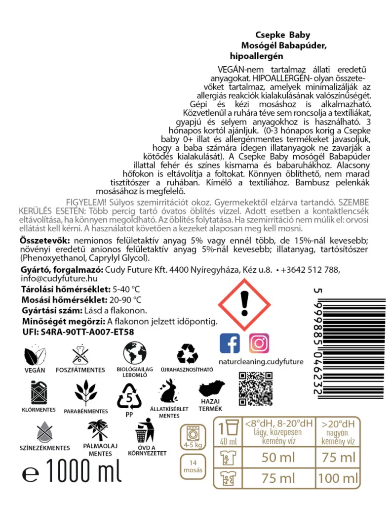A Csepke Baby 3m+ mosógél a család legkisebb tagjainak igényeire lett szabva. Illatosított, de allergénmentes összetételével 3 hónapos kortól biztonságosan használható. Kíméli az érzékeny bőrt, nem hagy vissza mosószermaradványokat, és már alacsony hőfokon is hatékonyan tisztít.