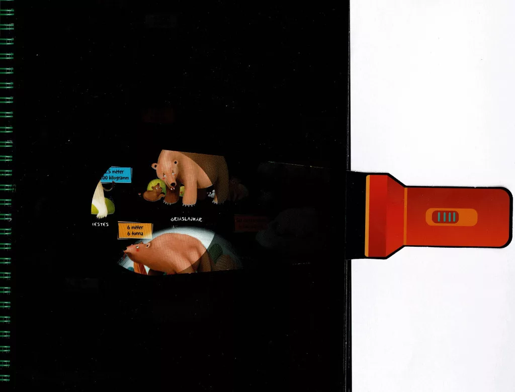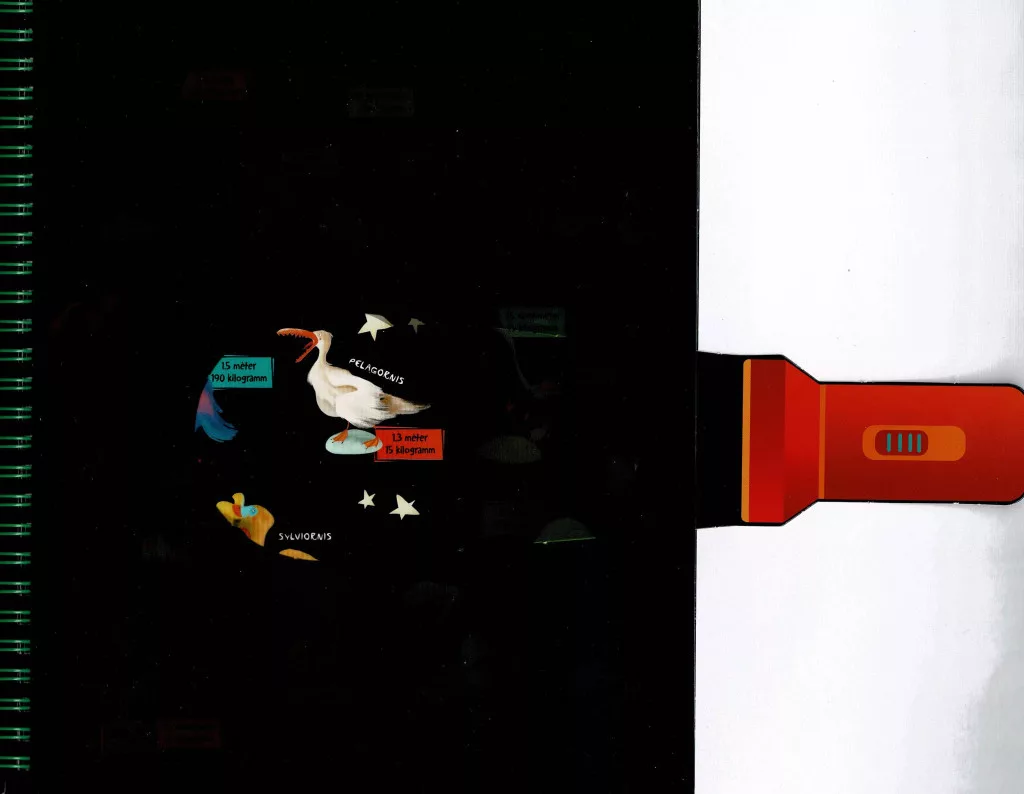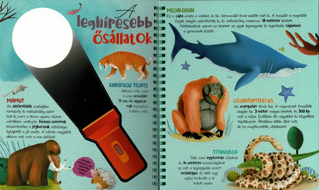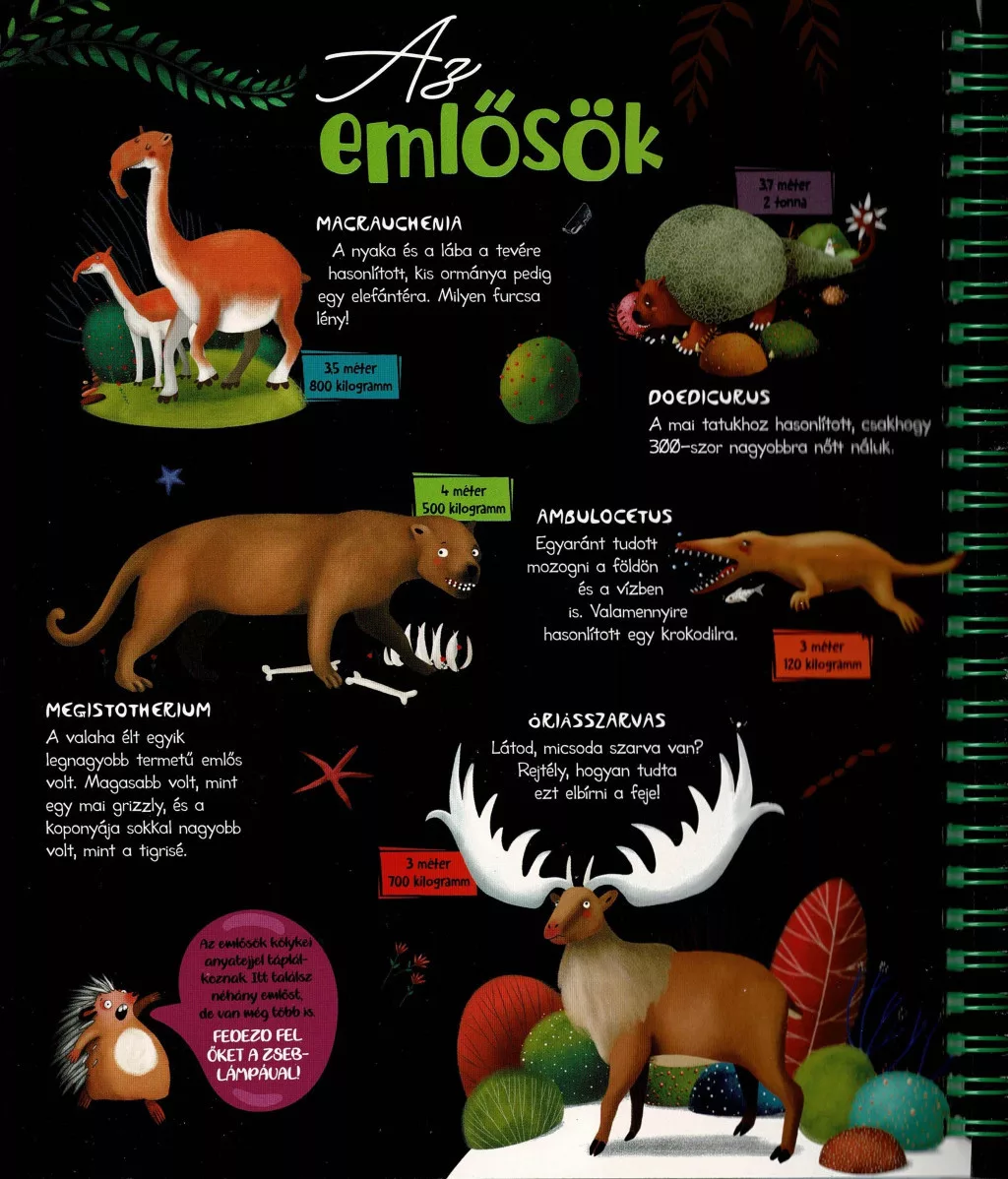 A könyvben található minden oldalpár egy-egy korszakot vagy élőhelyet mutat be – tele különleges, már kihalt élőlényekkel. A lapok vastag, strapabíró kartonból készültek, és minden oldalon található egy sötétített, fóliás rész, amely mögött elrejtve megbújik egy rejtett kép. Ezeket a titkos illusztrációkat csak a mellékelt piros műanyag csodalámpa segítségével lehet meglátni – és a gyerekek pontosan ezt imádják benne: az interaktív varázst, a saját felfedezés élményét.