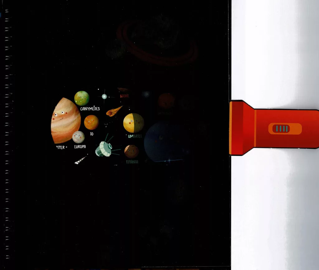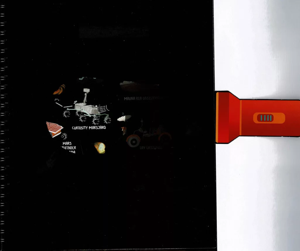 A könyv minden oldalán fekete fólia takarja az elrejtett illusztrációkat, melyek csak a mellékelt kartonlámpával válnak láthatóvá. Ez az egyedi megoldás nemcsak látványos, hanem rendkívül izgalmas is – hiszen a gyerekek maguk fedezhetik fel a rejtett képeket, újra és újra. Egy könyv, amit nemcsak olvasni lehet, hanem szó szerint felfedezni is!