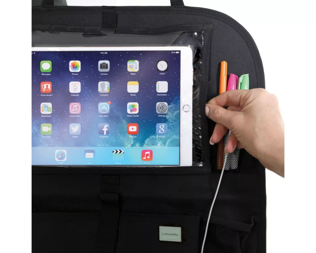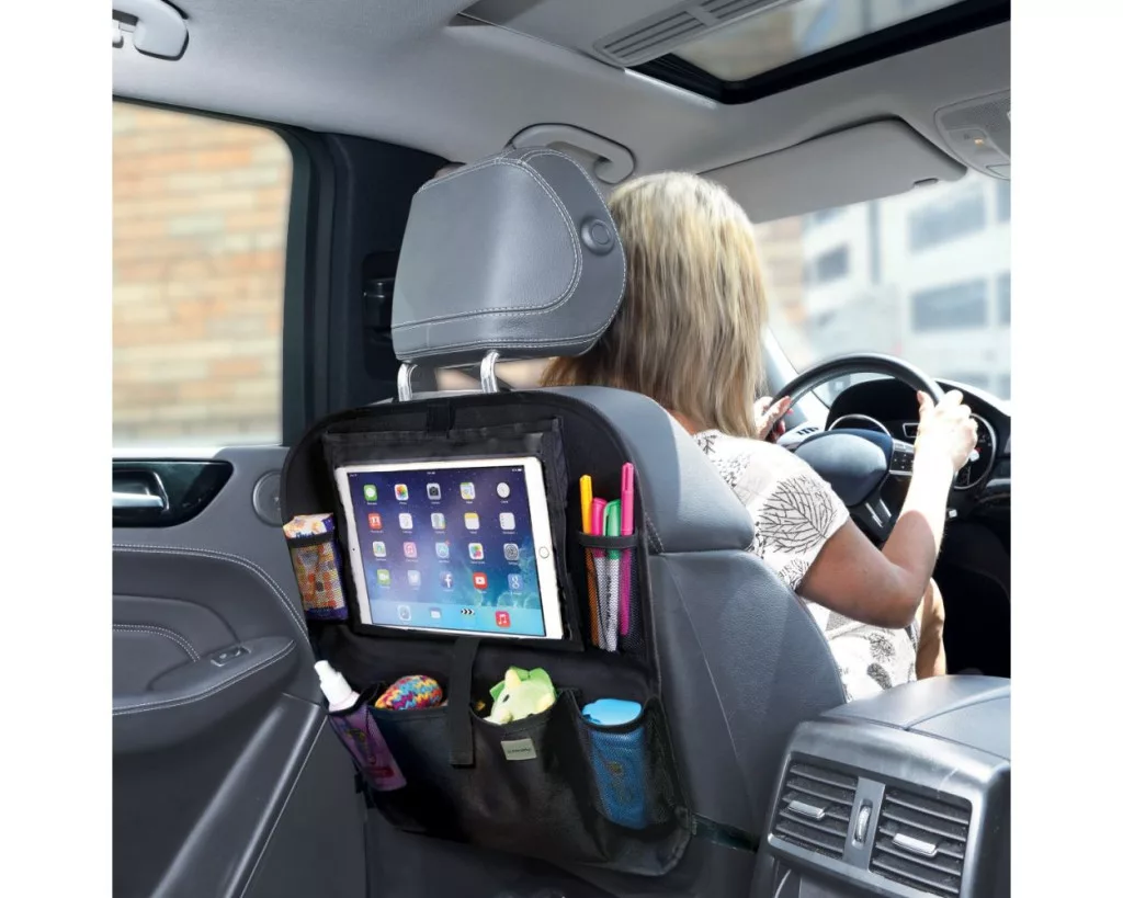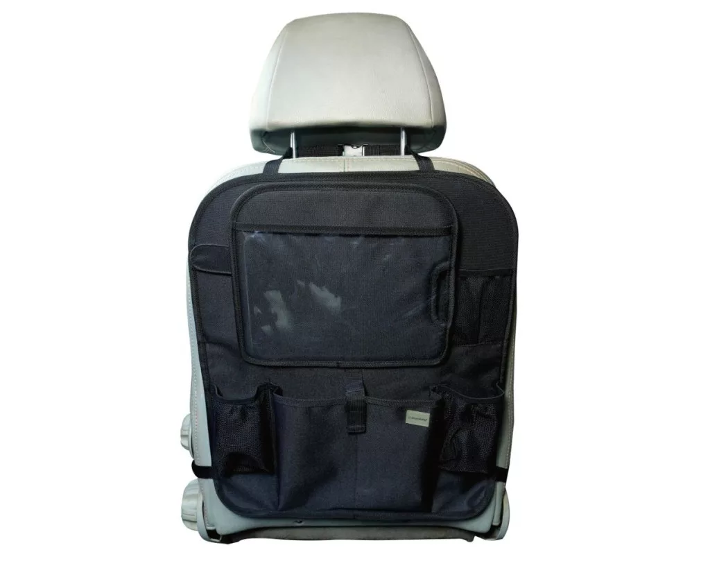 Rend az autóban, nyugalom az utakon! Ez a praktikus háttámla-rendező nemcsak rendszerezi a játékokat és apróságokat, hanem a tabletet is biztonságosan a helyén tartja.