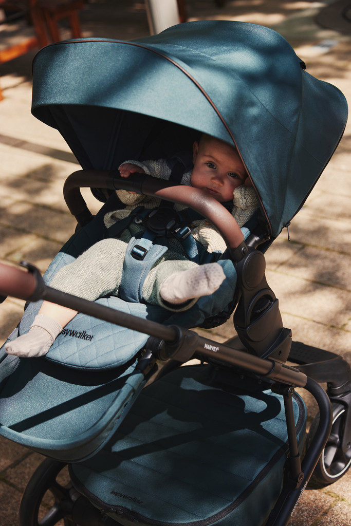 Így hódítjuk meg a terepet és az utcákat Minden a kényelmes utazásról szól Önnek és gyermekének. Bármikor alkalmas az idő kalandra, mert nagy és könnyen kezelhető kerekek biztosítják a városi utcákon vagy terepúton való siklást. Elegáns és könnyen állítható ülés, amely három különböző pozícióba dönthető egy kézzel. A tágas háttámla extra zsebbel rendelkezik a hátoldalon, és rendkívül kényelmes az előre formázott vállpárnáknak, a derékpántok párnáinak és a könnyen használható mágneses öt pontos övnek köszönhetően. Bármilyen is az időjárás, nem kell aggódnia. Gyermeke árnyékban vagy szépen szárazon marad a Harvey extra nagy napellenzőjének köszönhetően, amely ablakos és stílusos bőr részletekkel rendelkezik, 50-es UPF napvédelmet nyújt és vízlepergető.