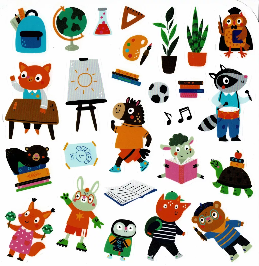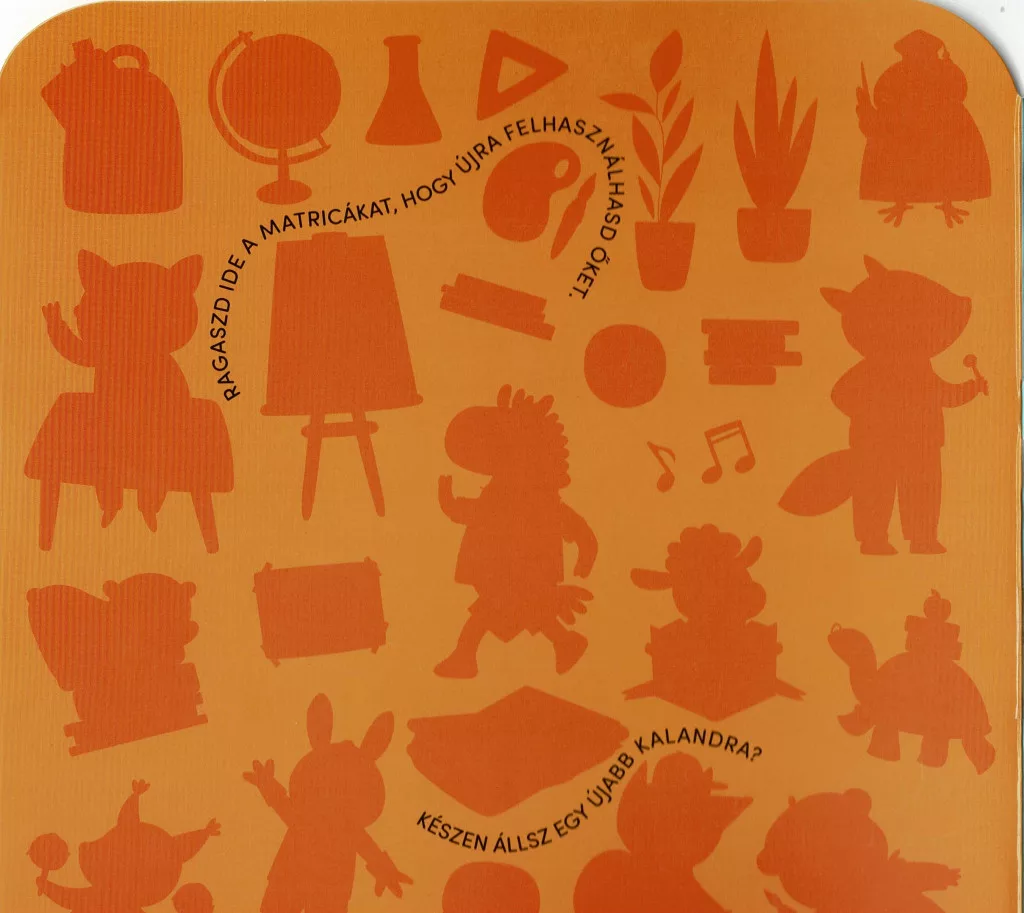 A kötethez tartozó újrahasználható matricák révén a gyerekek saját jeleneteket állíthatnak össze: hol a majom a legjobb tanuló, hol a víziló felel a táblánál, máskor a teknős bújik a könyvei mögé. A matricák bárhová ragaszthatók a könyv oldalain – vagy akár más sík felületeken is –, majd könnyedén visszaszedhetők és újrahasználhatók, így minden olvasás egy új játékélménnyé válik.