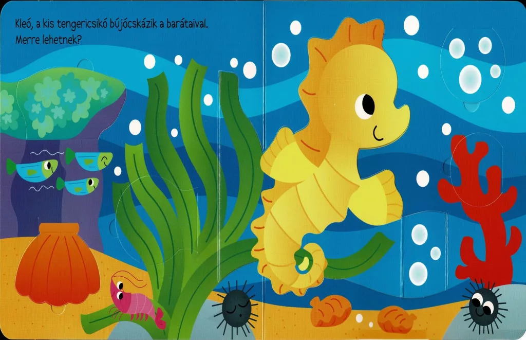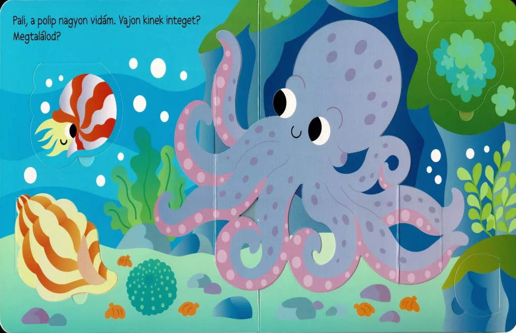 Merülj el a tenger mélyének titokzatos világában ezzel a bájos lapozókönyvvel, amely kifejezetten a legkisebbek számára készült. A "Ki bújt el? Tengeri állatok" című könyv egy varázslatos utazásra invitálja a gyerekeket, ahol a játékos tanulás és a felfedezés öröme kéz a kézben jár. A könyv lapjai között a kicsik találkozhatnak Kleóval, a kis tengericsikóval, aki éppen bújócskázik a barátaival, Pali polippal, aki vidáman integet, vagy Samuval, az éhes tarisznyarákkal, aki eleség után kutat.