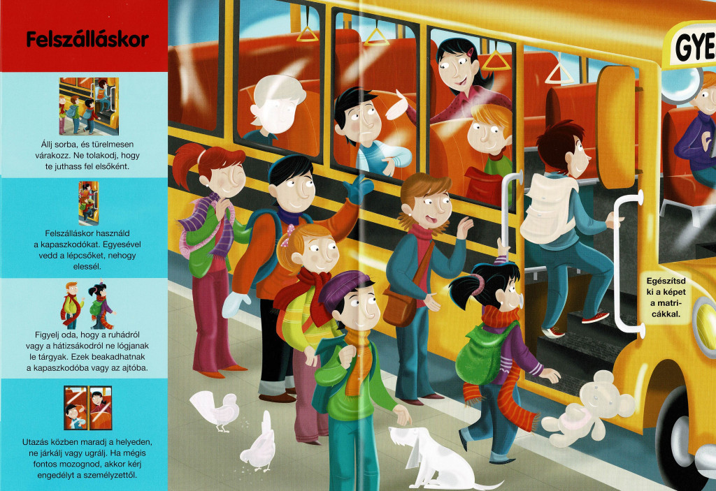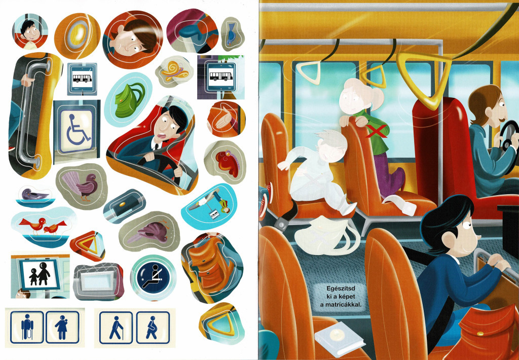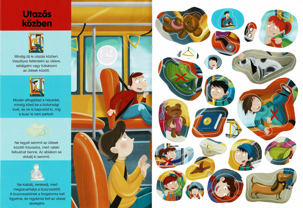 Kiemelt figyelmet kap az utazás alatti viselkedés: a könyv hangsúlyozza, hogy utazás közben ülni kell, kerülni kell a sétálgatást és játékot az ülések között, mivel ez könnyen balesethez vezethet. A matricás feladatok során a gyerekek olyan szituációkkal találkozhatnak, amelyekkel a mindennapokban is, például: mi történik, ha valaki leejt valamit a buszon, vagy miért nem szabad kiabálni, verekedni vagy az ablakon kihajolni. A foglalkoztató világosan elmagyarázza, hogy ezek mind a saját és mások testi épségét veszélyeztetik.