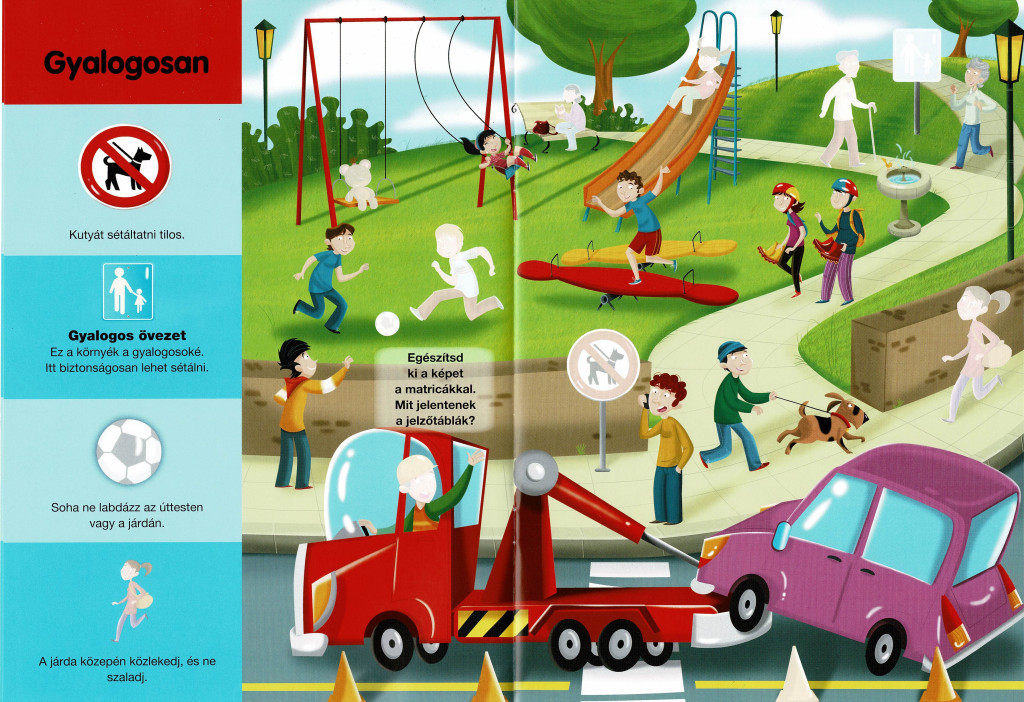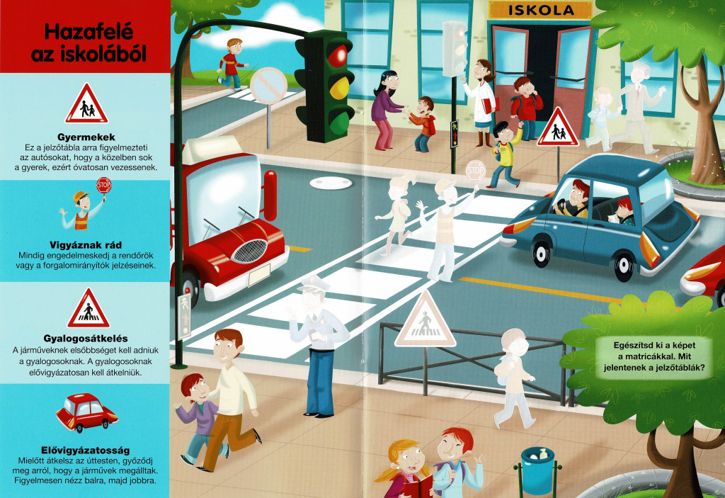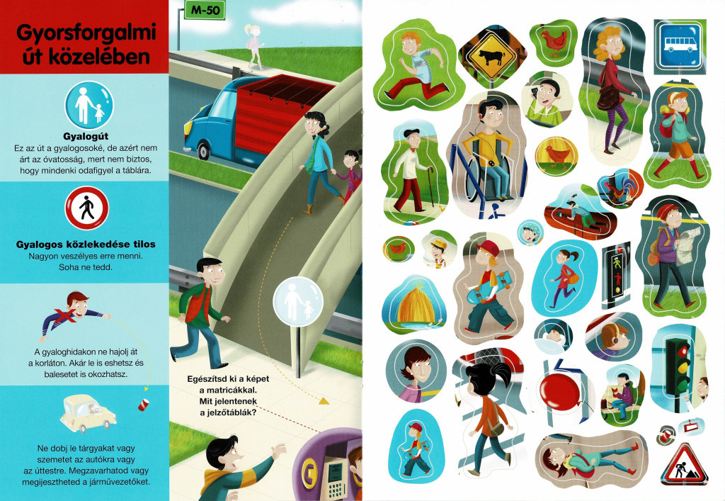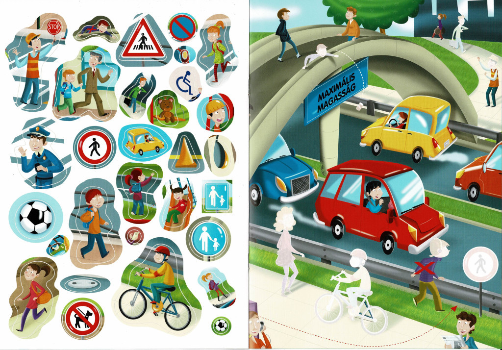 A gyerekek a matricák segítségével egészíthetik ki a jeleneteket, miközben megtanulják értelmezni a közlekedési táblákat, jelzéseket és szituációkat. A feladatok között szerepelnek olyan témák, mint például a zebrán való átkelés szabályai, a rendőr utasításainak követése, a veszélyek felismerése, vagy az, hogy miként viselkedjünk a gyaloghidakon és gyalogos zónákban. A matricázás során a gyerekek játékosan sajátítják el a szabályokat, miközben fejlődik a figyelmük, a kézügyességük és a problémamegoldó képességük is.