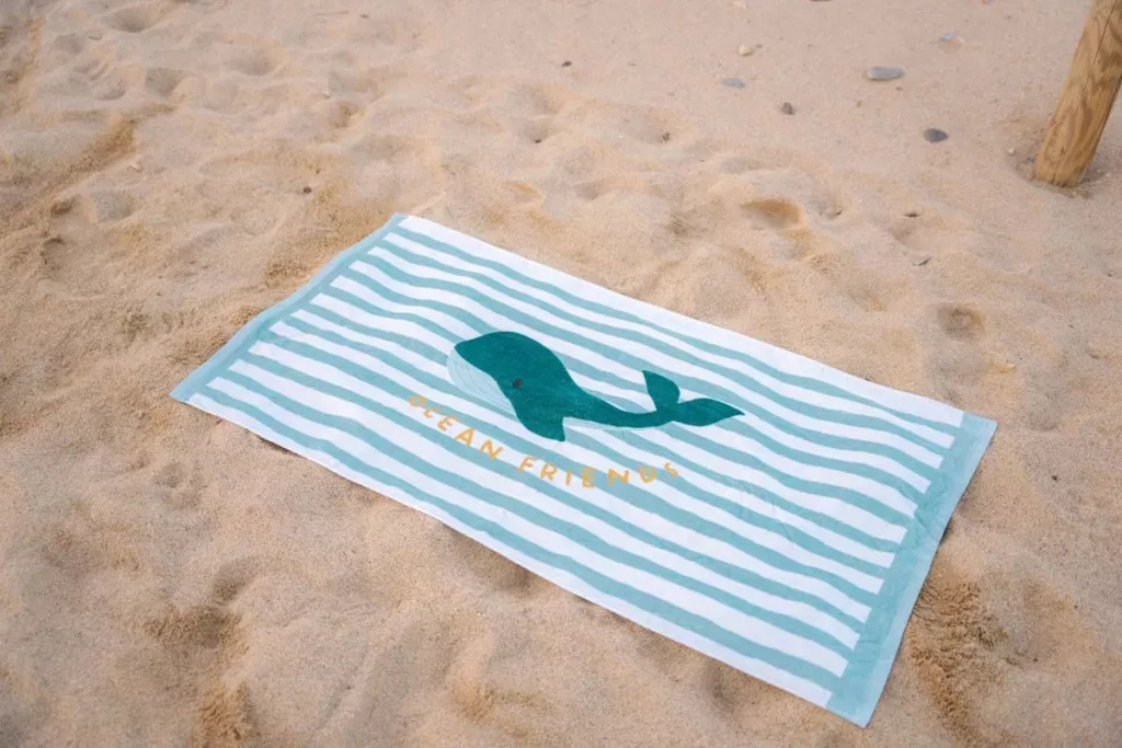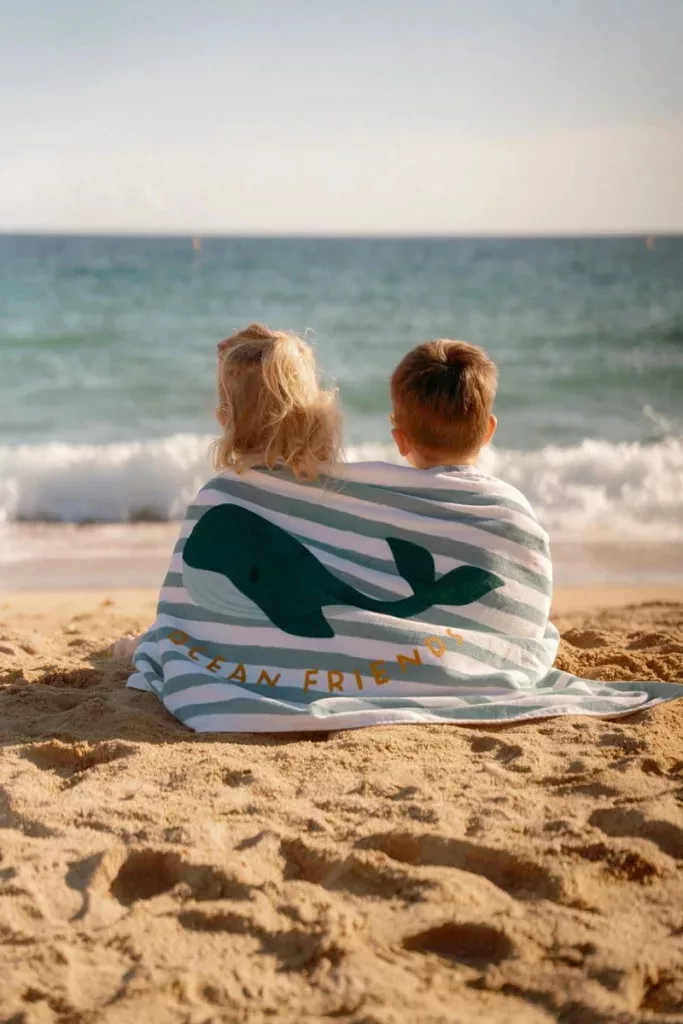 Merülj el a tenger színeiben ezzel a kalandokkal teli mintás strandtörölközővel, mely 100% organikus pamutból készült, hogy puha és bőrbarát legyen gyerkőcöd pancsolása után.
