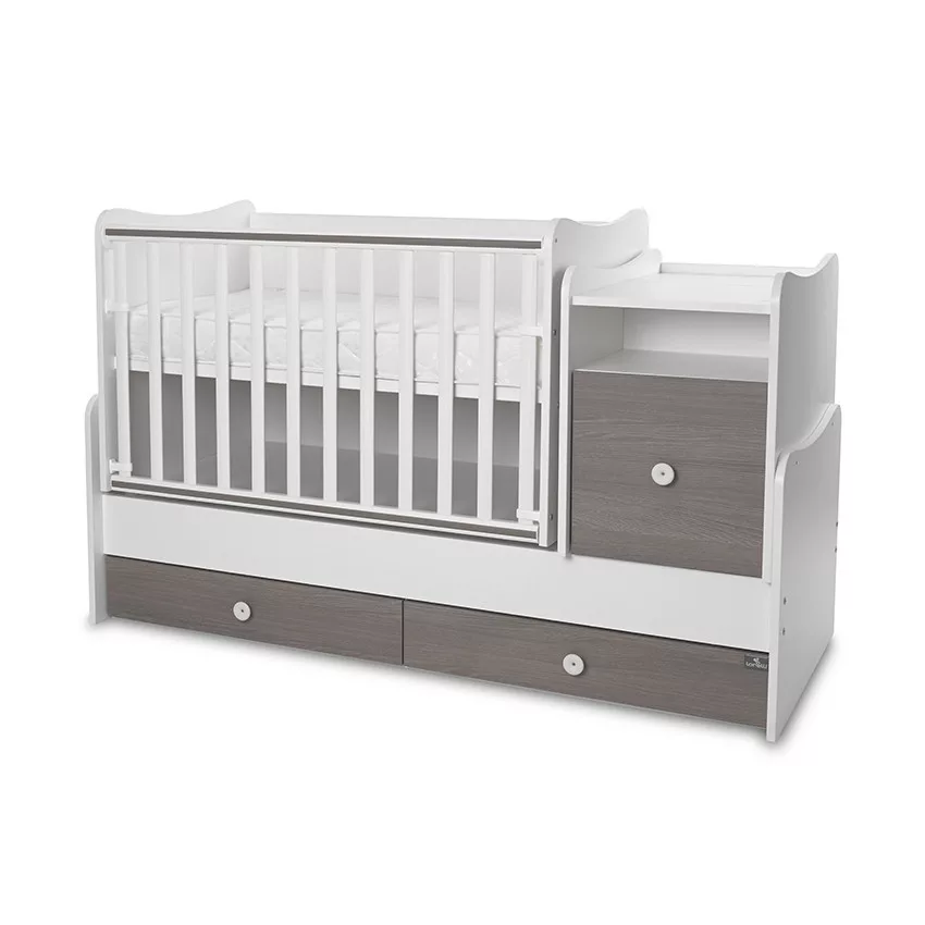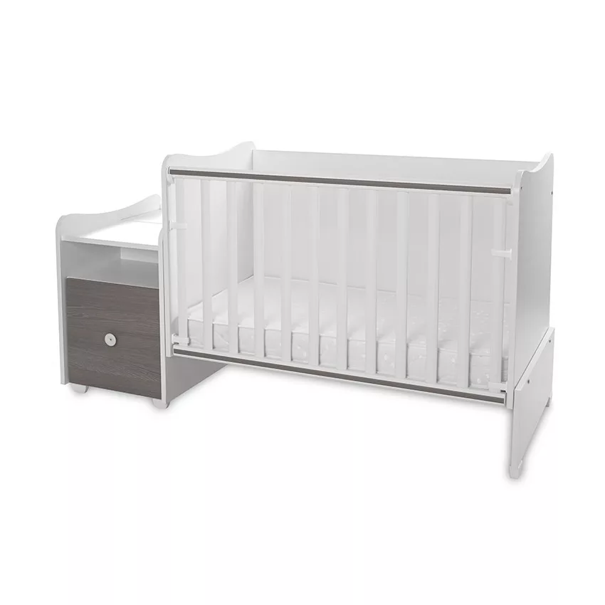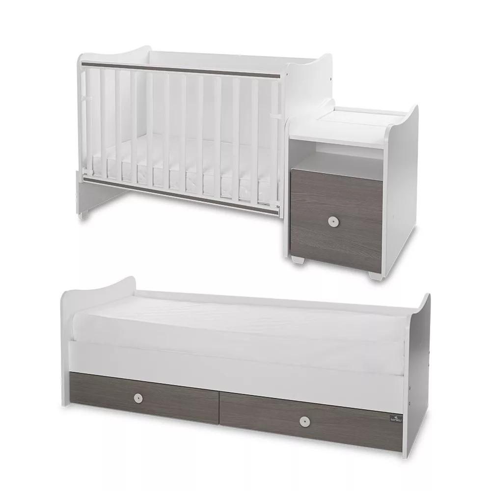 • Szuper megoldás, hogy a kiságy és a komód összetartozik, így nem kell két külön bútordarabot vásárolni. Amikor már nincs szükség rácsos kiságyra, a komód és a rácsok levételével egyszerűen át lehet alakítani ifjúsági heverővé és éjjeliszekrénnyé.