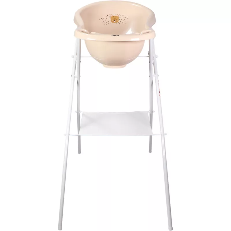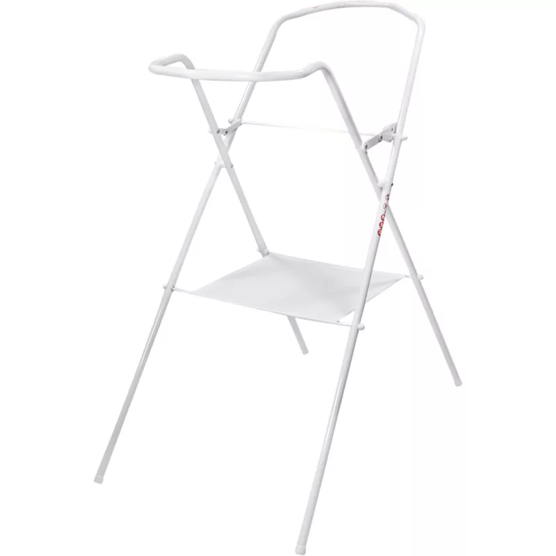 Állvány a fürdőkádhoz (84 cm), amely biztosítja a biztonságos és kellemes fürdést, anélkül, hogy feleslegesen megterhelné a szülők gerincét. Az állvány törölközőtartó polccal van felszerelve. Az állvány alsó része csúszásmentes. A termék összecsukható és könnyen használható.