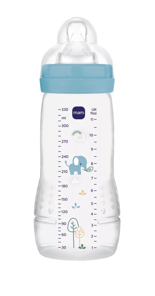 A MAM Easy Active™ cumisüveg ergonomikus formája jól illeszkedik a pici kezekbe, elősegítve a függetlenséget és rugalmasságot az etetés során.