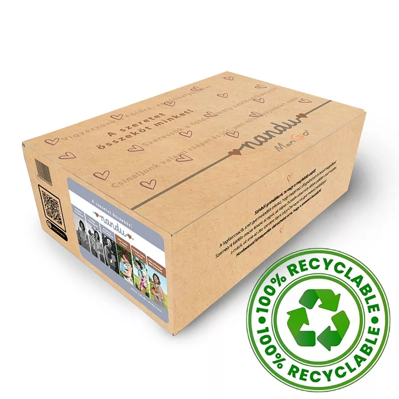 A NANDU Bébi Csatos hordozó környezetbarát kraft kartondobozban érkezik – mert a természetesség a csomagolásban is fontos.
