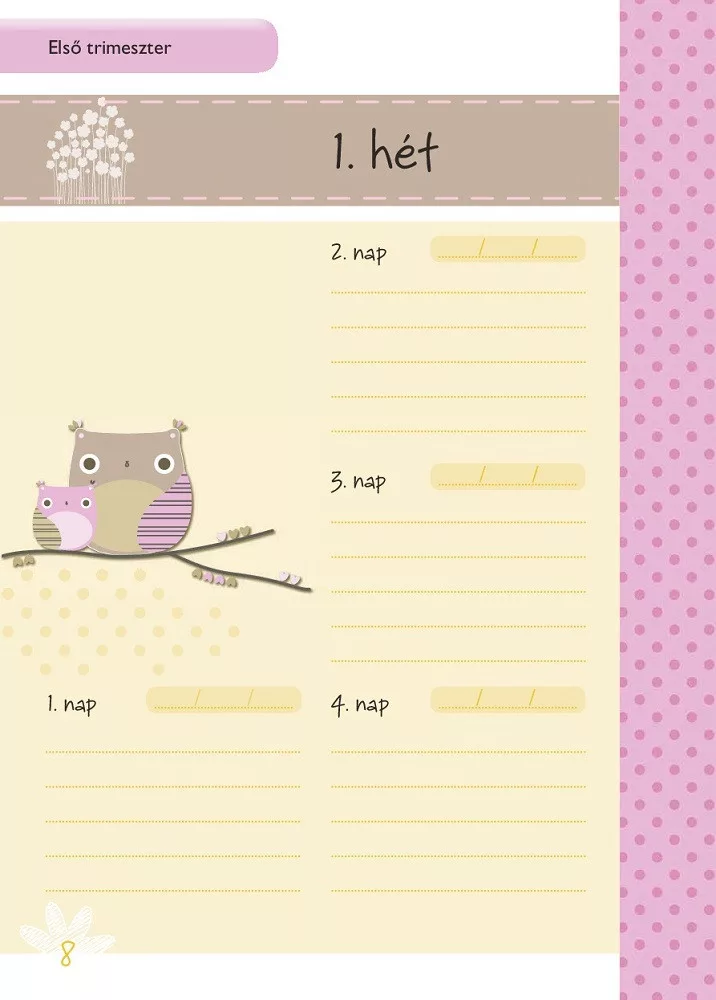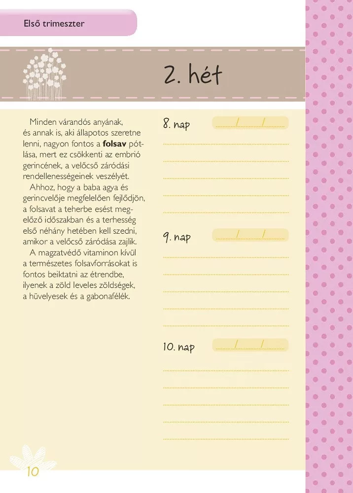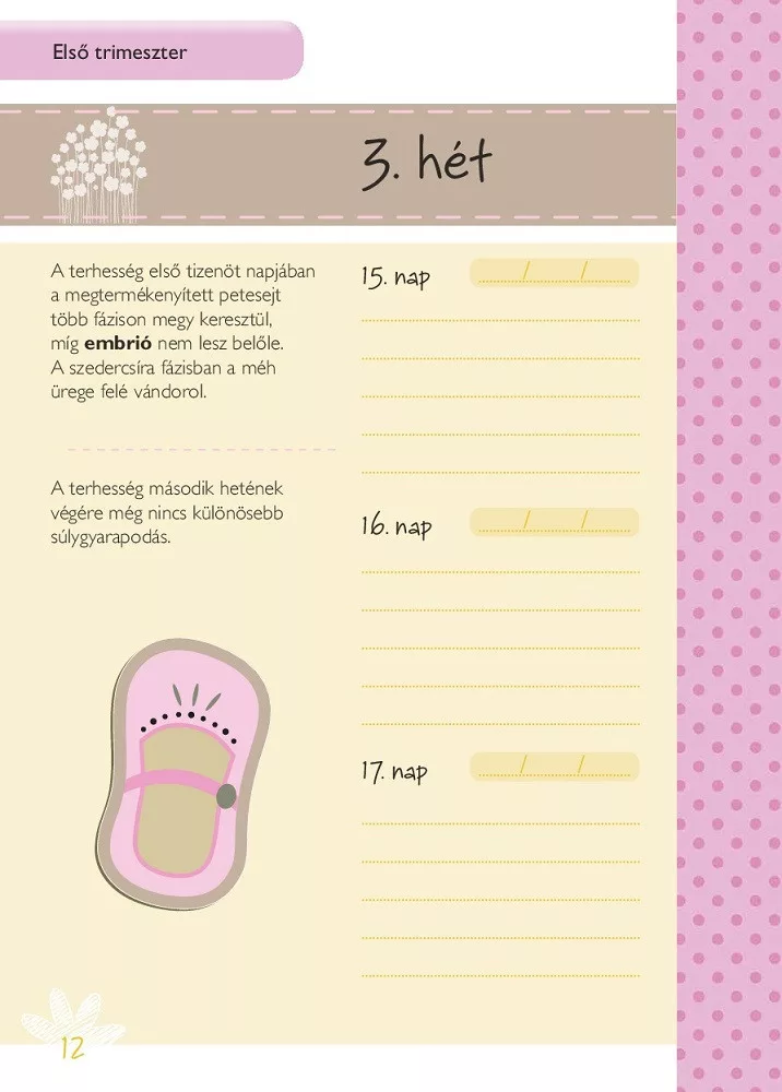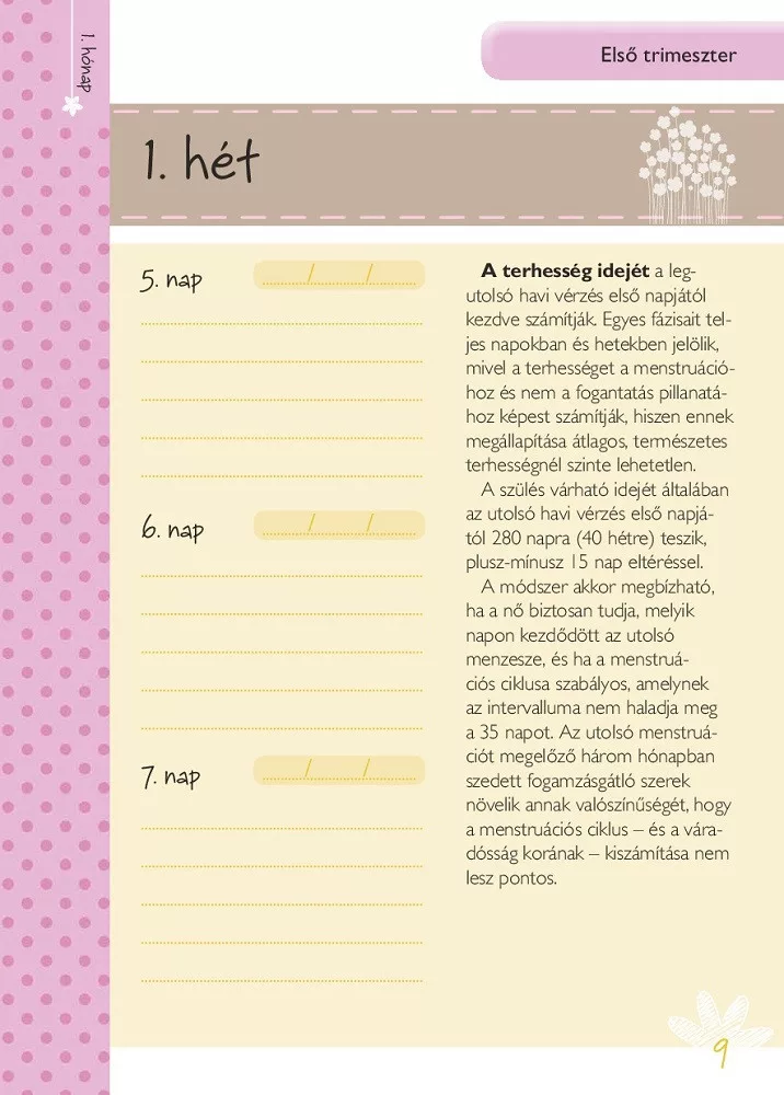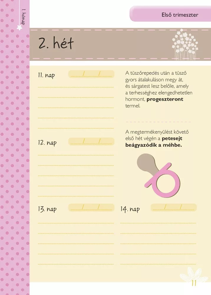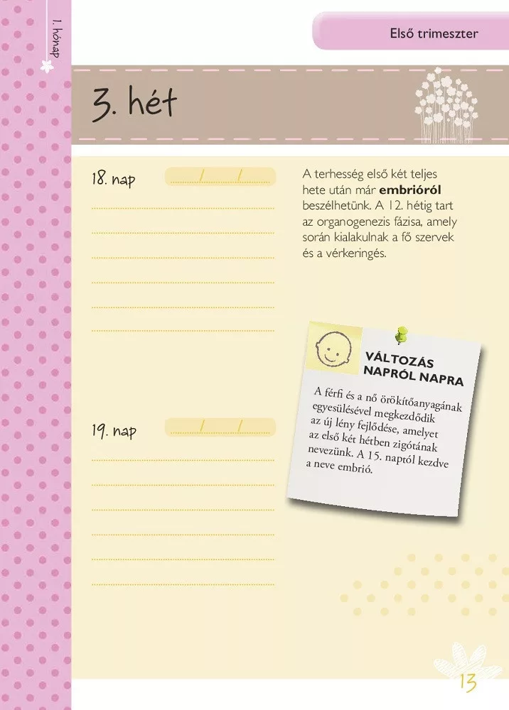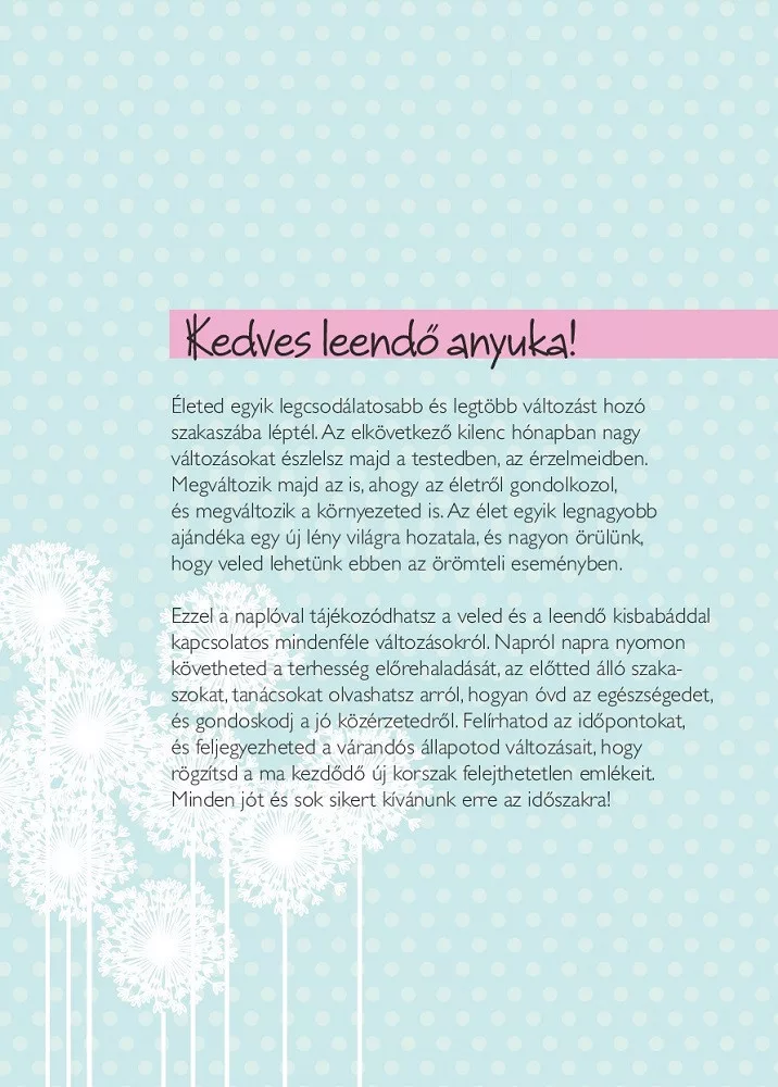 Életed egyik legcsodálatosabb és legtöbb változást hozó szakaszába léptél. Nagyon örülünk, hogy Veled lehetünk ebben az örömteli eseményben. Ez a napló segít abban, hogy nyomon kövesd a Veled és a születendő kisbabáddal történő változásokat. Feljegyezheted az időpontokat, várandós állapotod változásait, érzéseidet és félelmeidet, az új korszak felejthetetlen emlékeit.