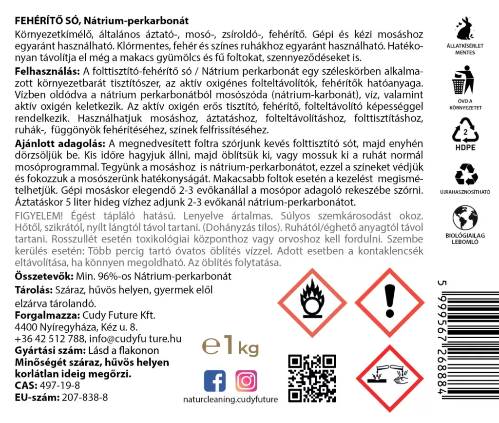 Természetes fehérítő só oxigénes hatással! Gépi és kézi mosáshoz, áztatáshoz és folttisztításhoz is kiváló. Környezetbarát, klórmentes megoldás a tiszta és friss ruhákért. Gyapjú és selyem kivételével minden anyagra ajánlott.
