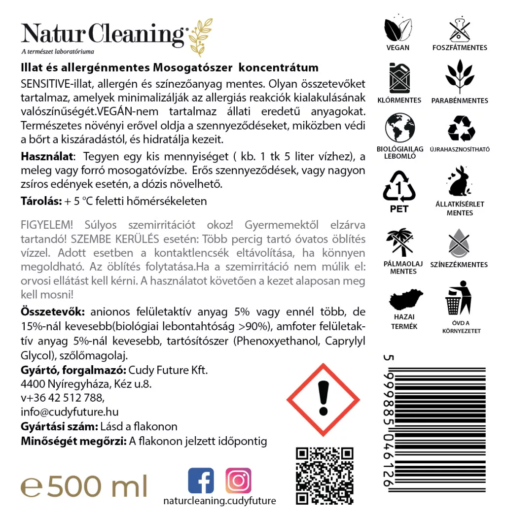 A NaturCleaning illat- és allergénmentes mosogatószer koncentrátum tökéletes választás azoknak, akiknek érzékeny a bőrük, vagy tudatosan kerülik az illatanyagokat és allergéneket. A vegán, természetes alapú formula nem tartalmaz foszfátot, klórt, parabéneket, pálmaolajat és semmilyen szintetikus illatanyagot. Ideális családoknak, kisgyermekes háztartásoknak, allergiásoknak és mindenkinek, aki a természetes tisztaság híve.