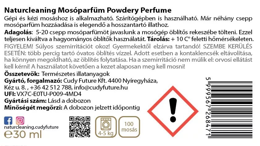 A Naturcleaning Powdery Perfume mosóparfüm a hagyományos öblítők modern, környezetbarát alternatívája. Intenzív, púderes illata hosszan megmarad a ruhákon, és már néhány csepp elegendő, hogy ruháid mosás után is frissen illatozzanak.