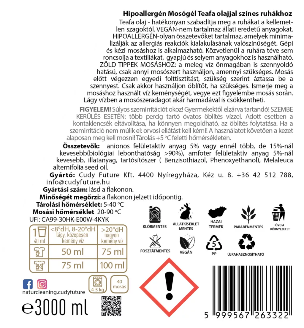 A Naturcleaning Teafa–Aloe hipoallergén mosógél a színes ruhák kíméletes, mégis hatékony tisztítószere. A teafaolaj természetes antibakteriális hatású, az aloe vera pedig nyugtatja a bőrt – így a mosás után a ruhák nemcsak tiszták, hanem puhák és frissen illatosak is lesznek, még öblítő használata nélkül is. Ez a mosógél tökéletes választás érzékeny bőrűeknek, allergiásoknak, kisgyermekes családoknak vagy bárkinek, aki természetes, környezetbarát megoldást keres.