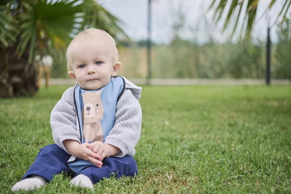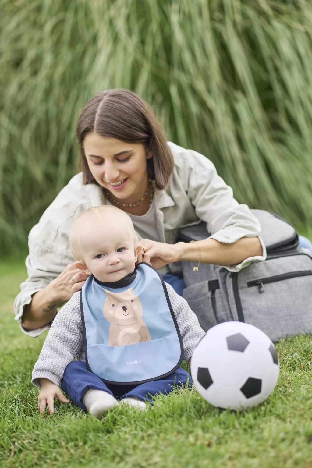 Vízlepergető anyagból készült, vidám mintás előke, amely kényelmes viselet, nem irritálja a gyerek bőrét.