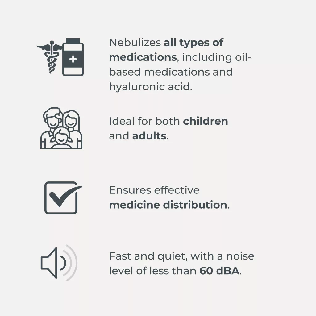 A NuvitaMed kompresszoros inhalátora egy sokoldalú és hatékony eszköz, amely bármilyen gyógyszerrel használható, beleértve az olajos alapú készítményeket és a hialuronsavat is.