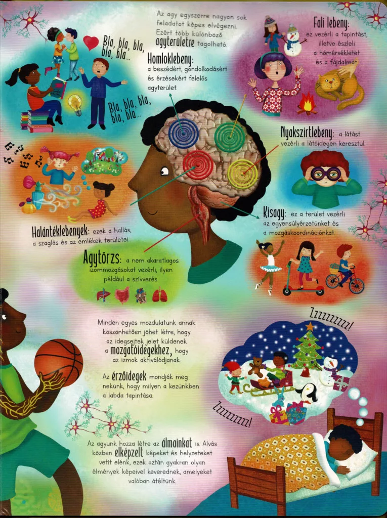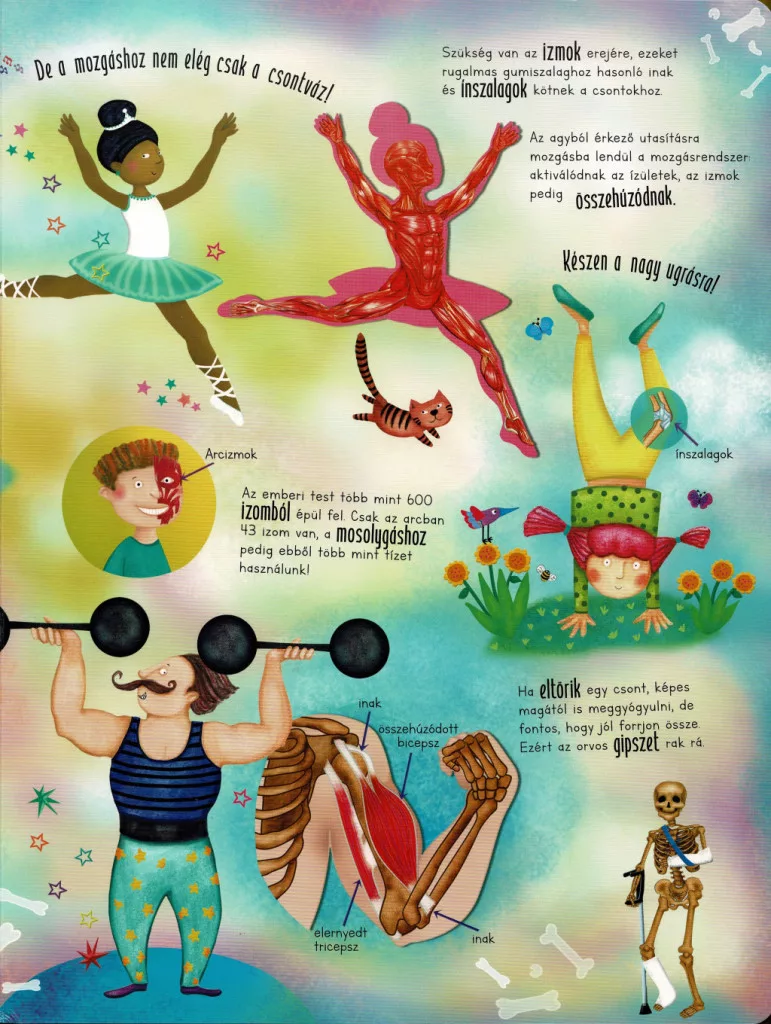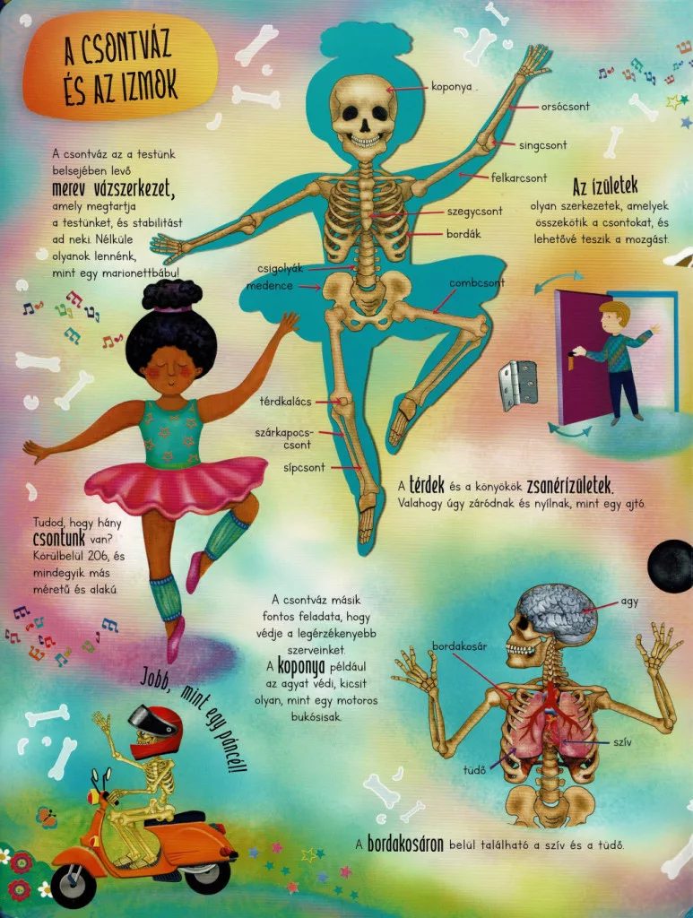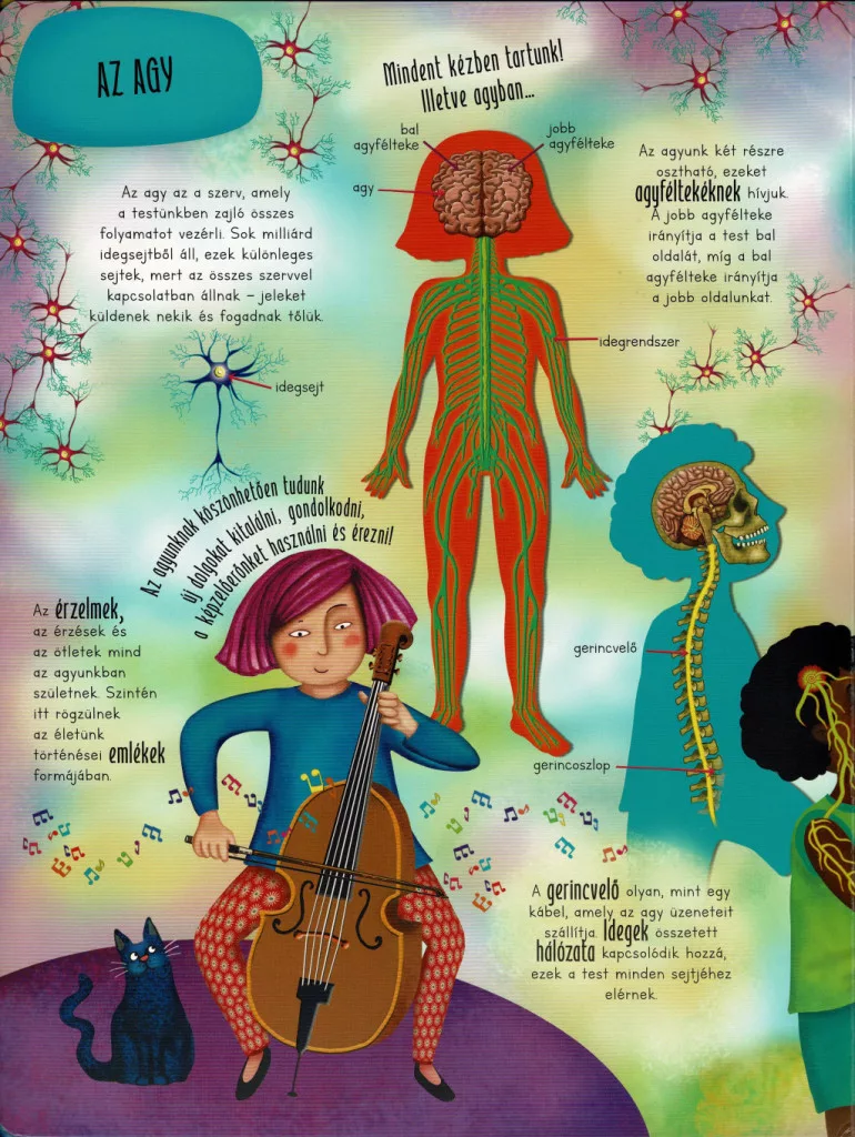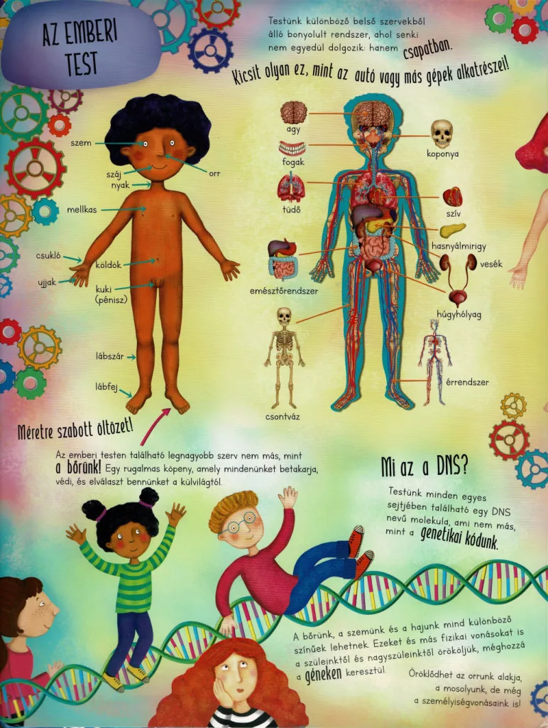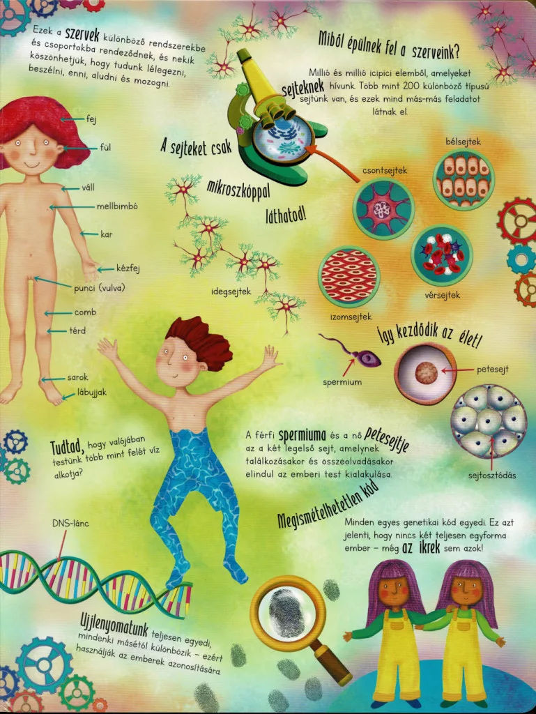 A kötet bemutatja a test főbb rendszereit és működését: a csontváz és az izmok felépítését, a szív és a vérkeringés működését, a légzés és az emésztés folyamatát, valamint az érzékszervek szerepét. A gyerekek megtudhatják, hány csont és izom alkotja a testünket, hogyan kering a vér nap mint nap, vagy éppen mi történik a táplálékkal az emésztőrendszerben. A könyv érthető módon mutatja be az agy és az idegrendszer szerepét is, így a gyerekek megismerhetik, hogyan irányítja gondolatainkat, mozgásainkat és érzelmeinket.