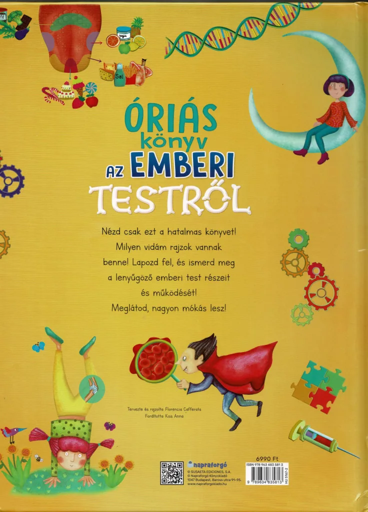 Az Óriás könyv az emberi testről egy látványos és szórakoztató ismeretterjesztő kötet, amely játékos formában vezeti be a gyerekeket a test működésének rejtelmeibe. A nagyméretű oldalak színes illusztrációi és közérthető magyarázatai révén a gyerekek könnyedén megérthetik, hogyan épül fel és működik a testük. A könyv nemcsak tudást ad, hanem élményt is nyújt: minden oldal új felfedezést tartogat, amely egyszerre tanít és szórakoztat.