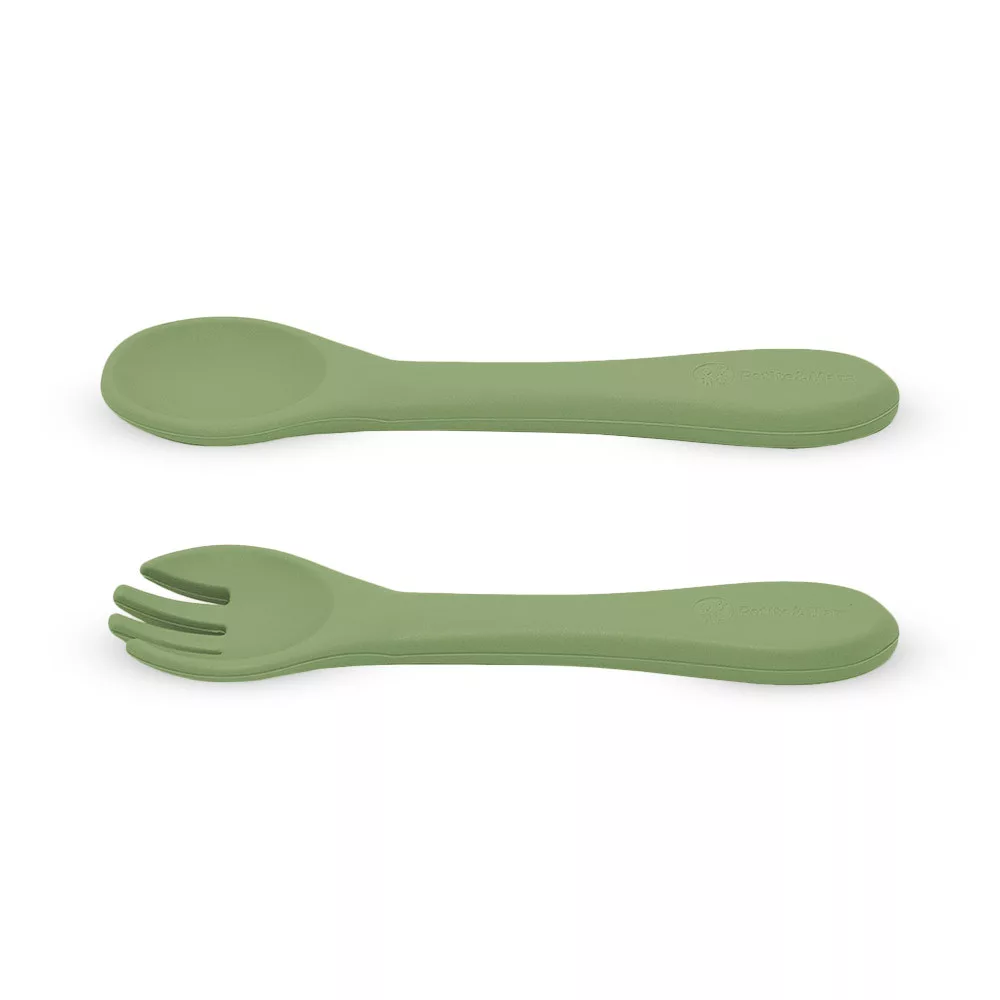 A villából és kanálból álló készlet teljes egészében BPA-mentes, élelmiszeripari minőségű szilikonból készült. Ennek köszönhetően gyermeke hideg és meleg ételt is ehet az evőeszközzel. A rugalmas szilikonnak köszönhetően az evőeszköz ideális a kisgyermekek érzékeny ínyéhez. Az evőeszközök 6 hónapos kortól alkalmasak olyan gyermekek számára, akiket most vezetnek be a változatos táplálkozásba, és azok számára, akik már sikeresen megtanultak önállóan enni. A lekerekített formák és a kis méret megkönnyíti a baba számára a megfogást és ezáltal az evést.