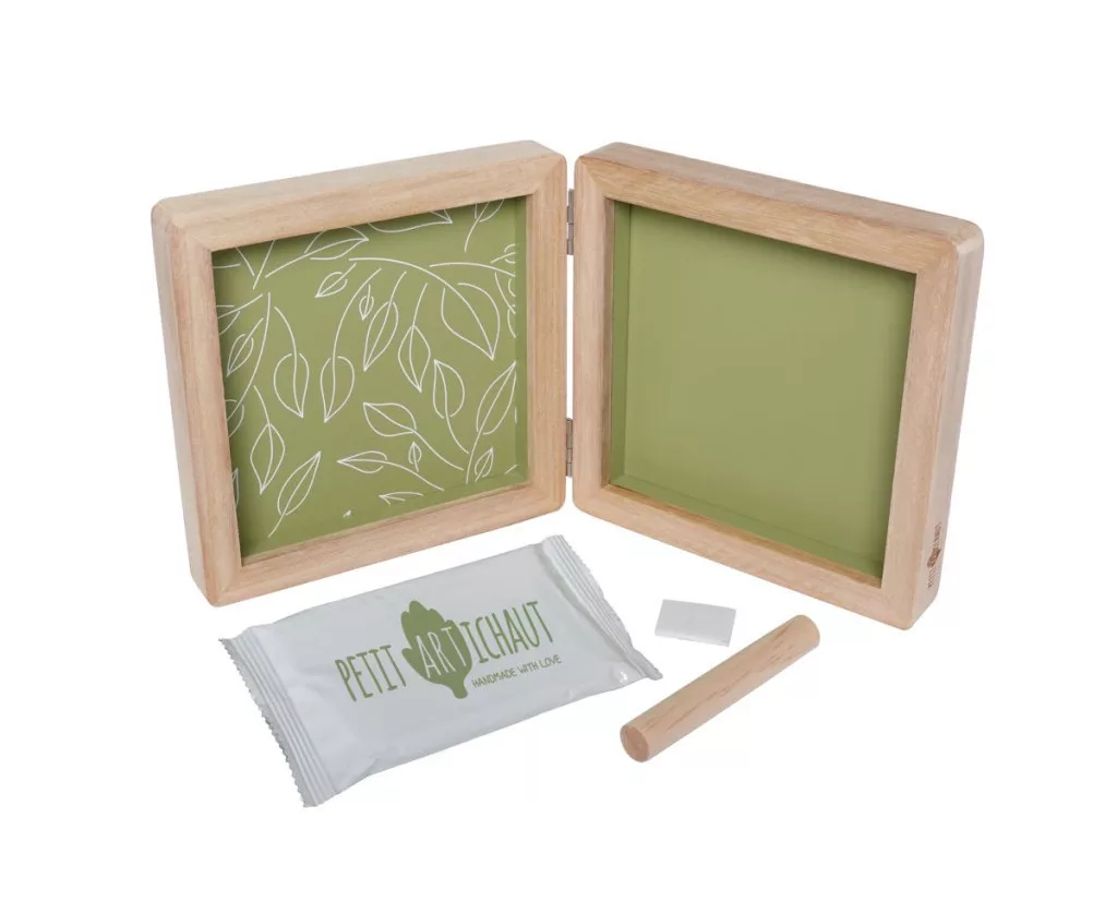 A készlet hipoallergén agyagot, hengert és utasításokat tartalmaz a lenyomat egyszerű elkészítéséhez.