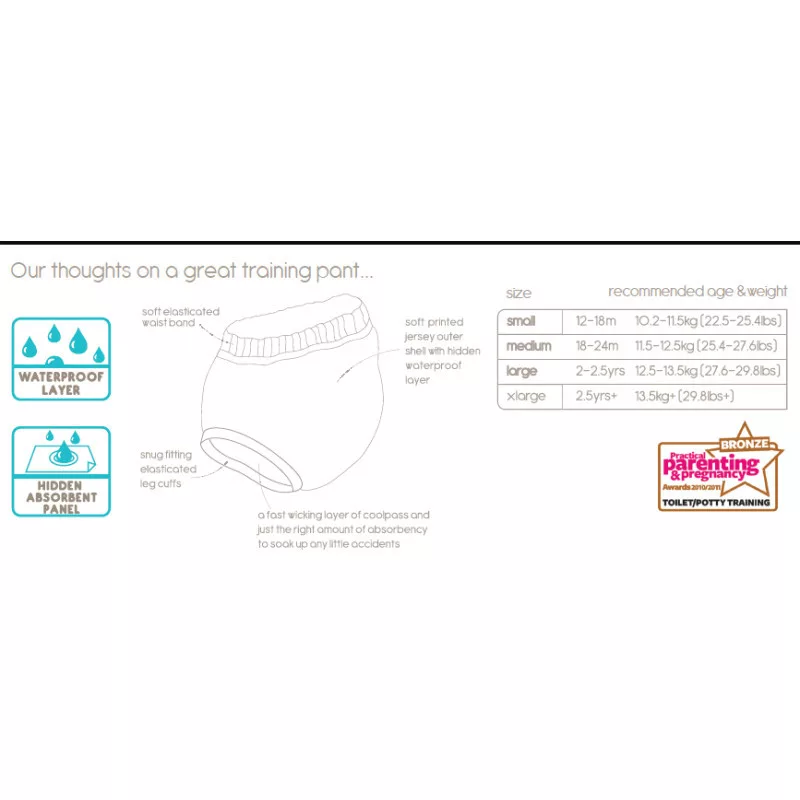 Egészen fél éves kortól ráadható a babára. Eldobható pelenkát használók számára ideálos, hogy a babával éreztesse a nedvességet. Egy éves kortól el lehet kezdeni az otthoni gyakorlást. A szobatisztulás folyamata közben, akár úton is használható a kissebb balesetek elkerülése érdekében. Utazáshoz ajánljuk a Pop-in nedvszívó autós ülésvédőjét, hogy az autó is megússza szárazon. 4-6 db nadrágpelenka bőven elegendő a leszoktatás teljes időszakára.