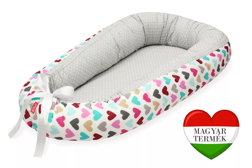 Scamp kókuszbetétes babafészek, szürke-pöttyös, színes-szívecskék mintával. Méretek:Teljes mérete: 55cm*85cmFekvőfelület: 30cm*70cmMagassága:12cm Anyaga:Huzat: 100% pamutvászonFekvőfelület: latexált kókuszKókuszmatrac huzata: 100% frottír (pamut)A kókuszbetétet matracvédő huzattal láttuk el, mely nem engedi át a nedvességet, mégis jól szellőző.Perem töltet: antiallergén, 100% szilikonizált poliészterA babafészekhez használt alapanyagok mind bevizsgált termékek, Oekotex 100 tanúsítvánnyal rendelkeznek. Kiegészítő információk:- A termék a kókuszbetét eltávolítása után 30°C-on klórmentes mosószerrel mosógépben mosható.- A perem töltet mosás során felfrissül, nem csomósodik.- A perem átfordítható, így a fészek mindkét oldalán használható.