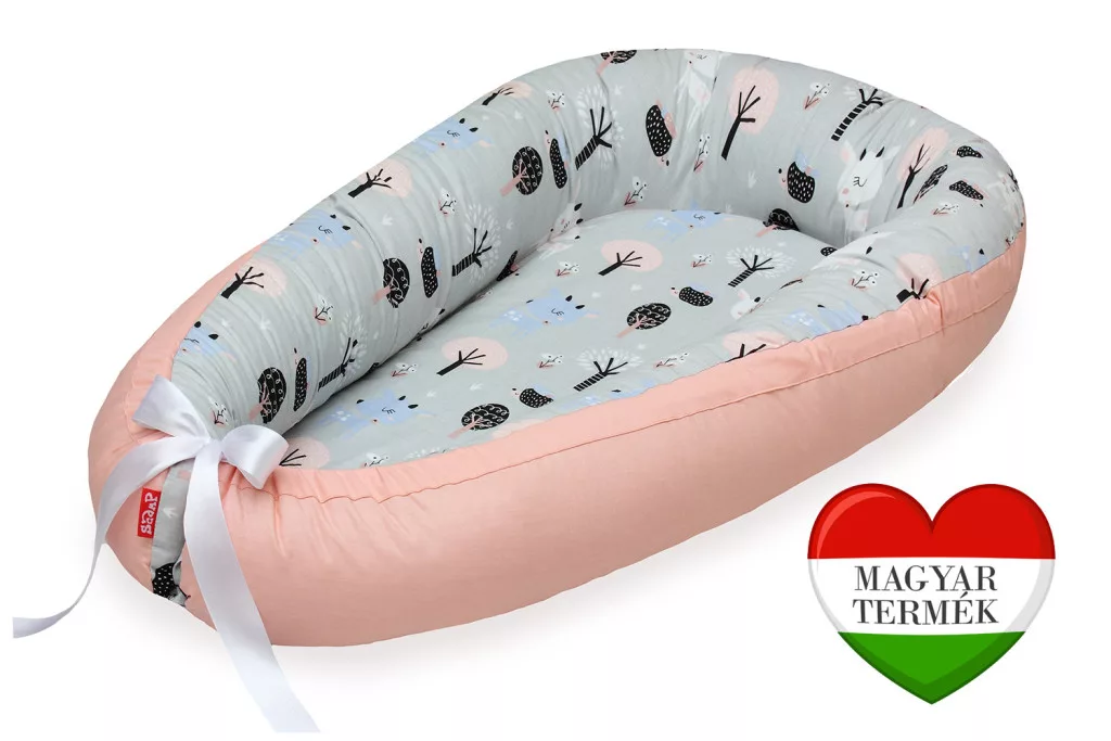 Scamp kókuszbetétes babafészek, egyik oldalán kedves erdei állatkák, másik oldalon barack színű. Méretek:Teljes mérete: 55cm*85cmFekvőfelület: 30cm*70cmMagassága:12cm Anyaga:Huzat: 100% pamutvászonFekvőfelület: latexált kókuszKókuszmatrac huzata: 100% frottír (pamut)A kókuszbetétet matracvédő huzattal láttuk el, mely nem engedi át a nedvességet, mégis jól szellőző.Perem töltet: antiallergén, 100% szilikonizált poliészterA babafészekhez használt alapanyagok mind bevizsgált termékek, Oekotex 100 tanúsítvánnyal rendelkeznek. Kiegészítő információk:- A termék a kókuszbetét eltávolítása után 30°C-on klórmentes mosószerrel mosógépben mosható.- A perem töltet mosás során felfrissül, nem csomósodik.- A perem átfordítható, így a fészek mindkét oldalán használható.