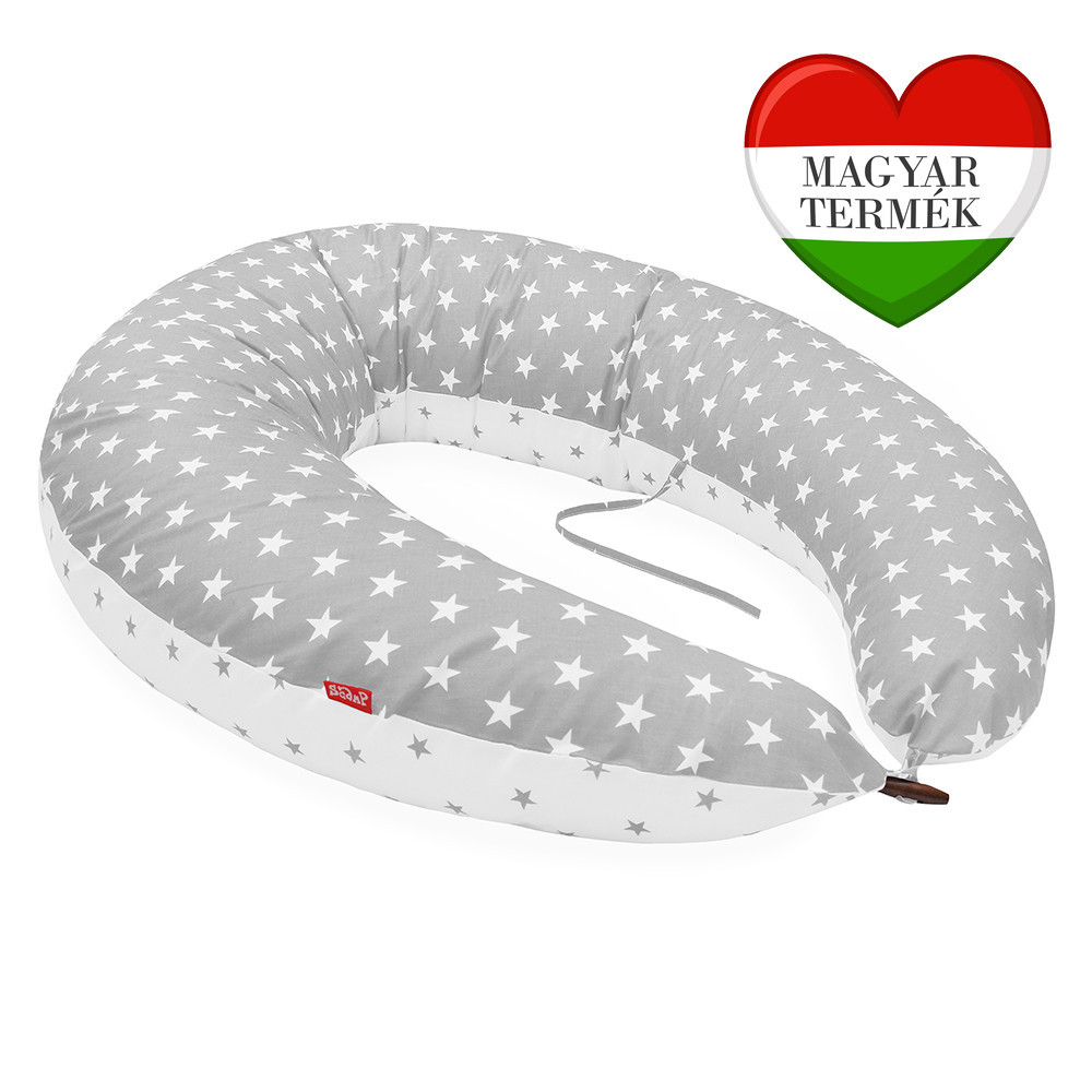 Scamp szoptatós párna fehér-szürke, csillagos mintával. Méretei:Külső íve: 235 cm, ami egy 160 cm feletti személynek is megfelelő kényelmet nyújtA két vége egymástól 140-145 cm, átmérője: 30 cm A termék két teljesen különálló belső és külső huzattal készül: * Egy mikrofiber belső huzat, ami 100% poliészter - magas hőfokon mosható,akár töltelékkel együtt is.* Cipzárral van ellátva, mely lehetővé teszi a töltelék szabályozását * A töltet szilikonizált poliészter, antiallergén és Oeko-tex tanúsítvánnyal rendelkezik. * Ez a töltet fajta lényegesen erősebb tartást biztosít. A hagyományos polisztirol gyöngy golyóval ellentétben a szilikonizált poliészter csendes, nem zörög, "zsizseg" * A külső huzat 100% pamut és szintén Oeko-tex minősítéssel rendelkezik. A párna vége gombbal van ellátva a könnyebb összeerősítés végett, a közepén egy párban kötöző, ami a szoptatáshoz és a baba pihenéséhez nyújt segítséget.