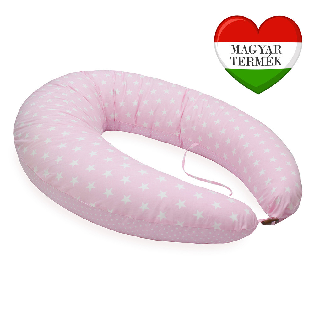 Scamp szoptatós párna rózsaszín-fehér, csillagos-pöttyös mintával. Méretei:Külső íve: 235 cm, ami egy 160 cm feletti személynek is megfelelő kényelmet nyújtA két vége egymástól 140-145 cm, átmérője: 30 cm .A termék két teljesen különálló belső és külső huzattal készül: * Egy mikrofiber belső huzat, ami 100% poliészter - magas hőfokon mosható,akár töltelékkel együtt is.* Cipzárral van ellátva, mely lehetővé teszi a töltelék szabályozását * A töltet szilikonizált poliészter, antiallergén és Oeko-tex tanúsítvánnyal rendelkezik. * Ez a töltet fajta lényegesen erősebb tartást biztosít. A hagyományos polisztirol gyöngy golyóval ellentétben a szilikonizált poliészter csendes, nem zörög, "zsizseg" * A külső huzat 100% pamut és szintén Oeko-tex minősítéssel rendelkezik..A párna vége gombbal van ellátva a könnyebb összeerősítés végett, a közepén egy párban kötöző, ami a szoptatáshoz és a baba pihenéséhez nyújt segítséget.