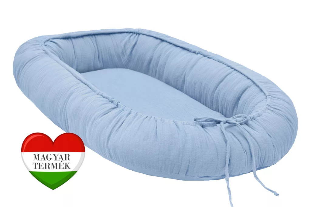 Scamp muszlin babafészek, babakék színben.Méretek:Teljes mérete: 50cm×80cmFekvőfelülete: 28×60 cmMagassága:12cm Anyaga:Huzat: 100% pamut un. muszlinPerem töltet: antiallergén, 100% szilikonizált poliésztergolyóA termék a fekvőbetét eltávolítása után 30°C-on klórmentes mosószerrel mosógépben mosható.A perem töltet mosás során felfrissül, nem csomósodik.A babafészek cipzárral van ellátva, mely lehetővé teszi a töltet mennyiségének szabályozását.