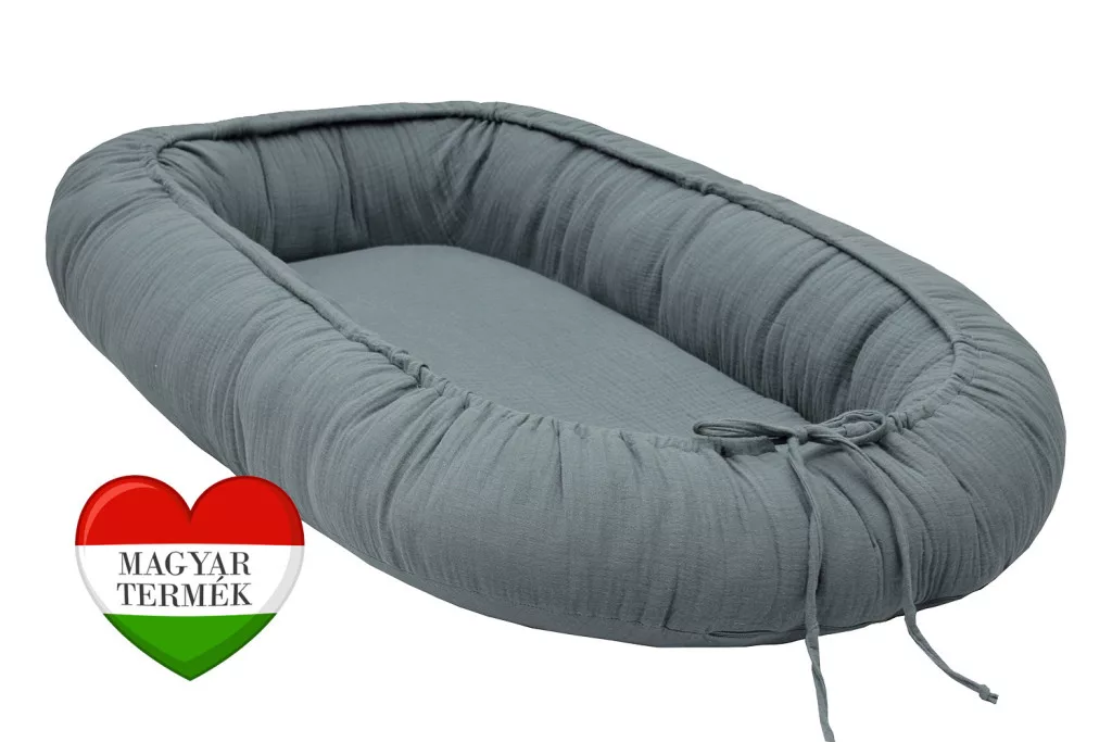 Scamp muszlin babafészek, szürke színben.Méretek:Teljes mérete: 50cm×80cmFekvőfelülete: 28×60 cmMagassága:12cm Anyaga:Huzat: 100% pamut un. muszlinPerem töltet: antiallergén, 100% szilikonizált poliésztergolyóA termék a fekvőbetét eltávolítása után 30°C-on klórmentes mosószerrel mosógépben mosható.A perem töltet mosás során felfrissül, nem csomósodik.A babafészek cipzárral van ellátva, mely lehetővé teszi a töltet mennyiségének szabályozását.