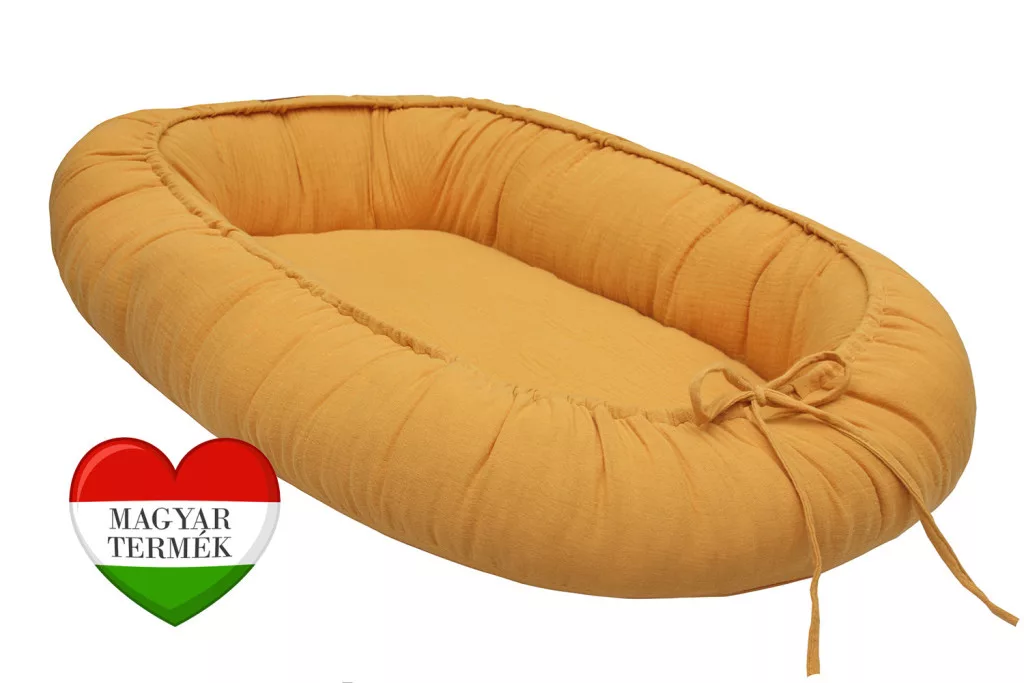 Scamp muszlin babafészek, mustársárga színben.Méretek:Teljes mérete: 50cm×80cmFekvőfelülete: 28×60 cmMagassága:12cm Anyaga:Huzat: 100% pamut un. muszlinPerem töltet: antiallergén, 100% szilikonizált poliésztergolyóA termék a fekvőbetét eltávolítása után 30°C-on klórmentes mosószerrel mosógépben mosható.A perem töltet mosás során felfrissül, nem csomósodik.A babafészek cipzárral van ellátva, mely lehetővé teszi a töltet mennyiségének szabályozását.