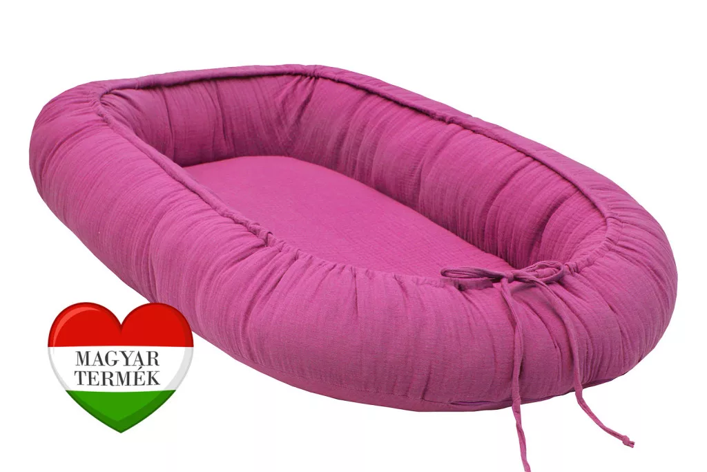 Scamp muszlin babafészek, pink színben.Méretek:Teljes mérete: 50cm×80cmFekvőfelülete: 28×60 cmMagassága:12cm Anyaga:Huzat: 100% pamut un. muszlinPerem töltet: antiallergén, 100% szilikonizált poliésztergolyóA termék a fekvőbetét eltávolítása után 30°C-on klórmentes mosószerrel mosógépben mosható.A perem töltet mosás során felfrissül, nem csomósodik.A babafészek cipzárral van ellátva, mely lehetővé teszi a töltet mennyiségének szabályozását.
