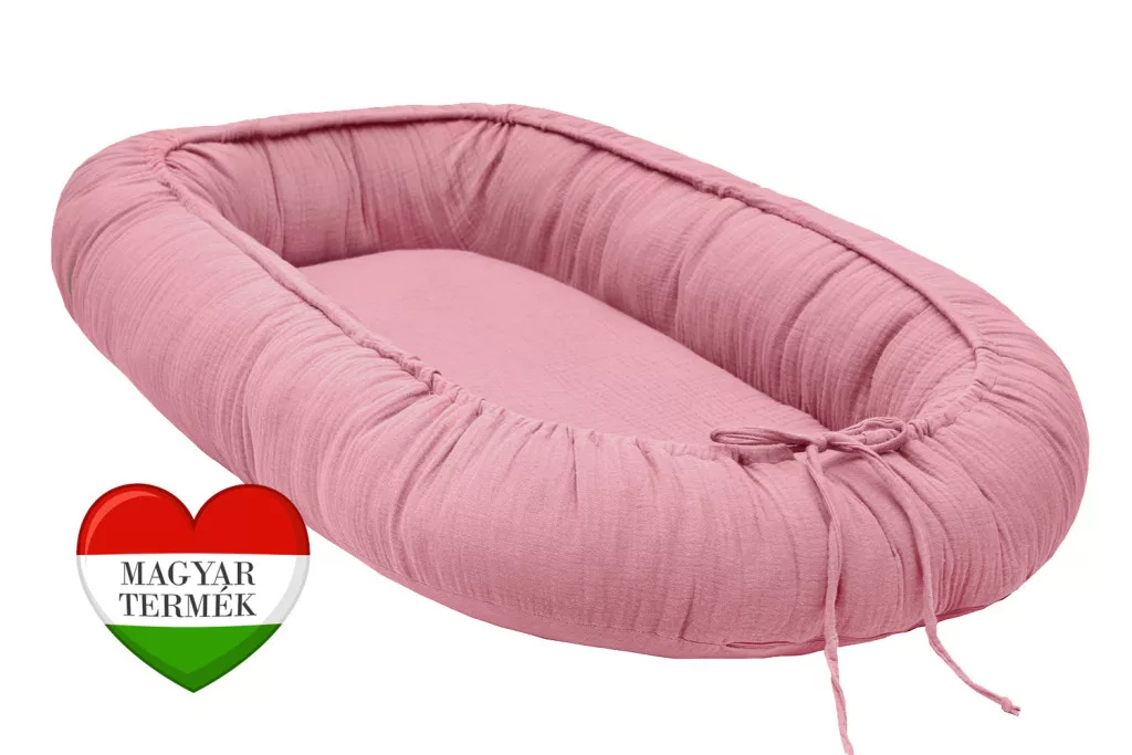 Scamp muszlin babafészek, fáradt rózsaszín.Méretek:Teljes mérete: 50cm×80cmFekvőfelülete: 28×60 cmMagassága:12cm Anyaga:Huzat: 100% pamut un. muszlinPerem töltet: antiallergén, 100% szilikonizált poliésztergolyóA termék a fekvőbetét eltávolítása után 30°C-on klórmentes mosószerrel mosógépben mosható.A perem töltet mosás során felfrissül, nem csomósodik.A babafészek cipzárral van ellátva, mely lehetővé teszi a töltet mennyiségének szabályozását.