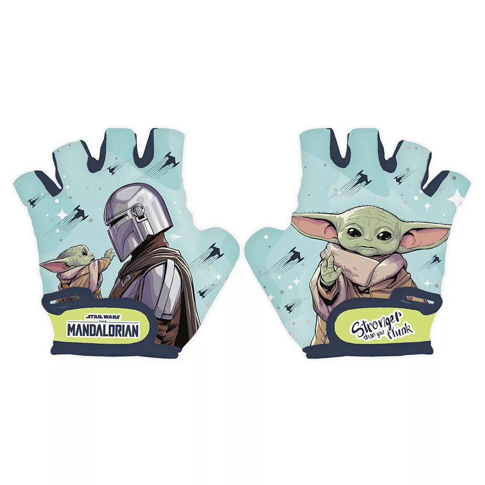A kerékpáros kesztyűk tartós anyagokból készülnek, színes mintával, Star Wars karakterekkel díszítve. A kesztyűk tépőzárasak, így könnyen illeszkednek a baba kezére. A kesztyű alja speciális anyaggal van szegélyezve, amely jó párnázottságot biztosít, és lehetővé teszi a gyermek számára, hogy biztonságosan fogja a kormánykereket.