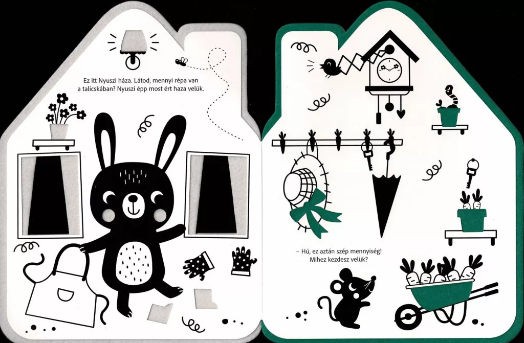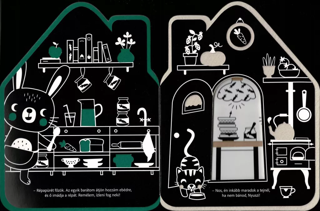A fekete-fehér, kontrasztos illusztrációk segítik a kicsik figyelmének megragadását, míg a színes plüssoldalak különleges élményt nyújtanak. A kedves történet során a gyerekek megismerkedhetnek Nyuszi barátaival is, akik együtt élvezik a finom ebédet és a közös időtöltést.
