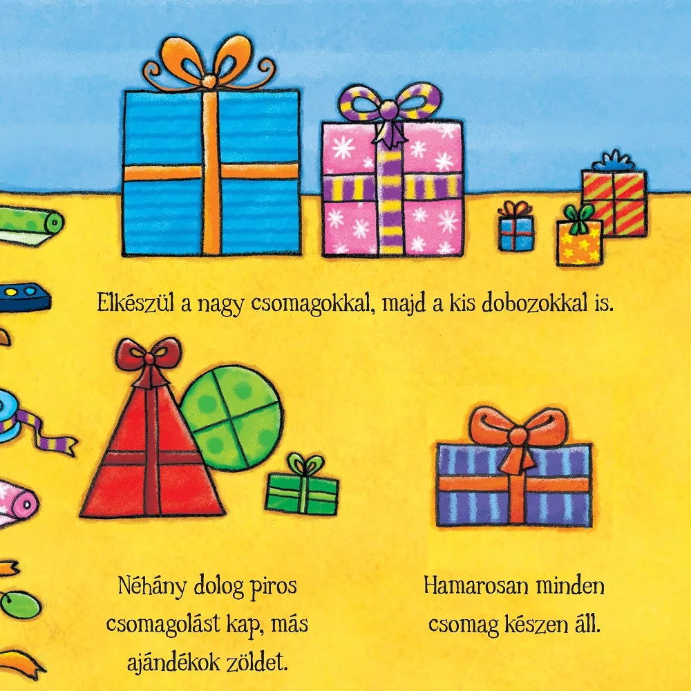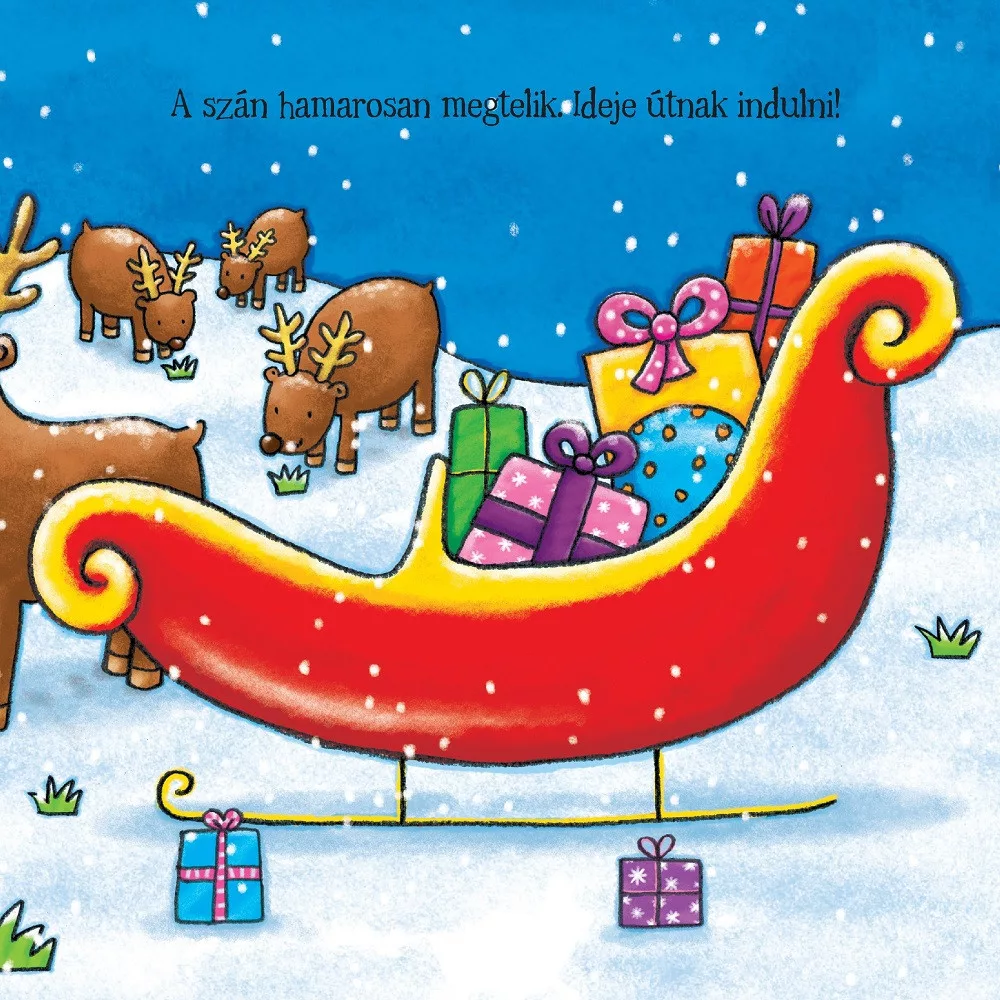 A Mikulás nagy napja” című könyvben a kicsik a Mikulással együtt élhetik át az ünnepi készülődést és ajándékozást. A könyv lapjain rengeteg izgalmas kaland vár, miközben a gyerekek megismerkednek a színek, formák, számok és ellentétek világával. A simogatható oldalak és kedves illusztrációk különleges élményt nyújtanak. Ez a könyv tökéletes módja annak, hogy a gyerekek az ünnepek varázslatát érezzék, és közben játszva tanuljanak.