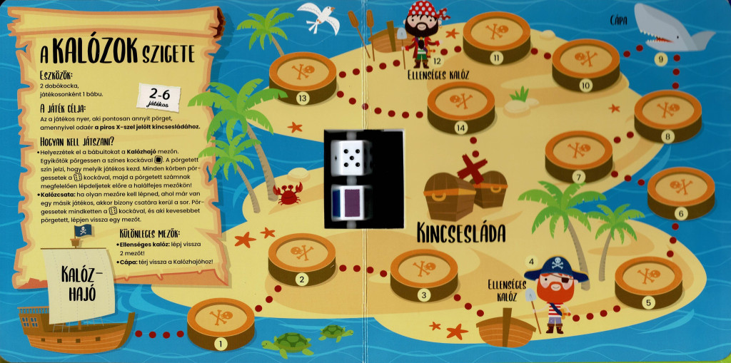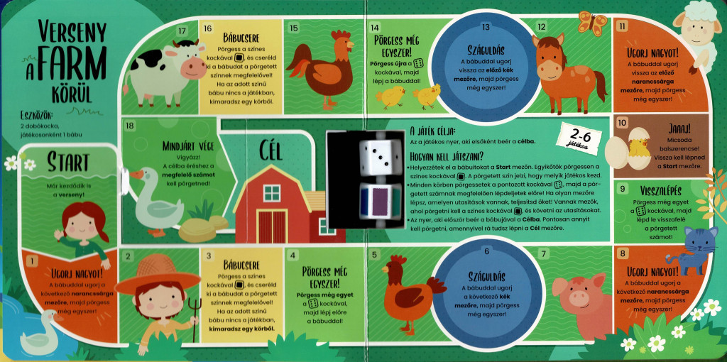 A dobozban található játékok: Verseny a farm körül, Űrutazás, Betűpálya és A kalózok szigete – mindegyik saját játéktáblával, egyszerű szabályokkal, színes grafikákkal és rengeteg mókával.