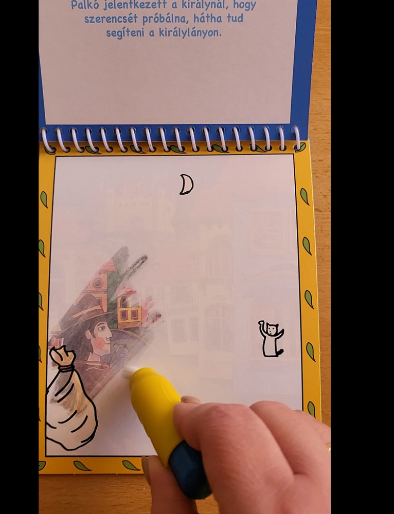 Vedd ki a varázstollat! Távolítsd el a fedelet, töltsd fel a tollat vízzel, majd óvatosan csavard vissza a fedelet. Kérheted felnőtt segítségét is. Most következik a színezés. Óvatosan tedd a varázstoll ecsetét egy pontra, és húzd végig a képen az ecsetet. Ahogy dolgozol az ecsettel, a víz hatására előbukkannak a színek. Ha már nem akarsz dolgozni a varázstollal, mindig öntsd ki belőle a vizet, és töröld le az ecsetet. Ha befejezted a munkát, a víz meg fog száradni a képen, ezért a színek elhalványodnak. De bármikor újra előhívhatod őket a varázstollal!