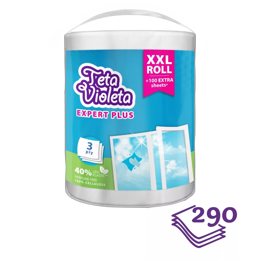 A Violeta XXL Expert Plus papírtörlő 100% cellulózból készült és teljesen biztonságos a bőrrel és az élelmiszerekkel való érintkezés során. A három réteg maximális nedvszívó képességet tesz lehetővé és kivételes szilárdságot biztosít. A Violeta XXL Expert Plus papírtörlő kiváló választás üveg és más sima felületek tisztítására, mivel nagy nedvszívó képességgel rendelkezik, és nem hagy nyomot a felületeken. A 290 lapos papírtörlő csomagolása 40%-kal kevesebb műanyagot tartalmaz. A termék foggantyúval rendelkezik.