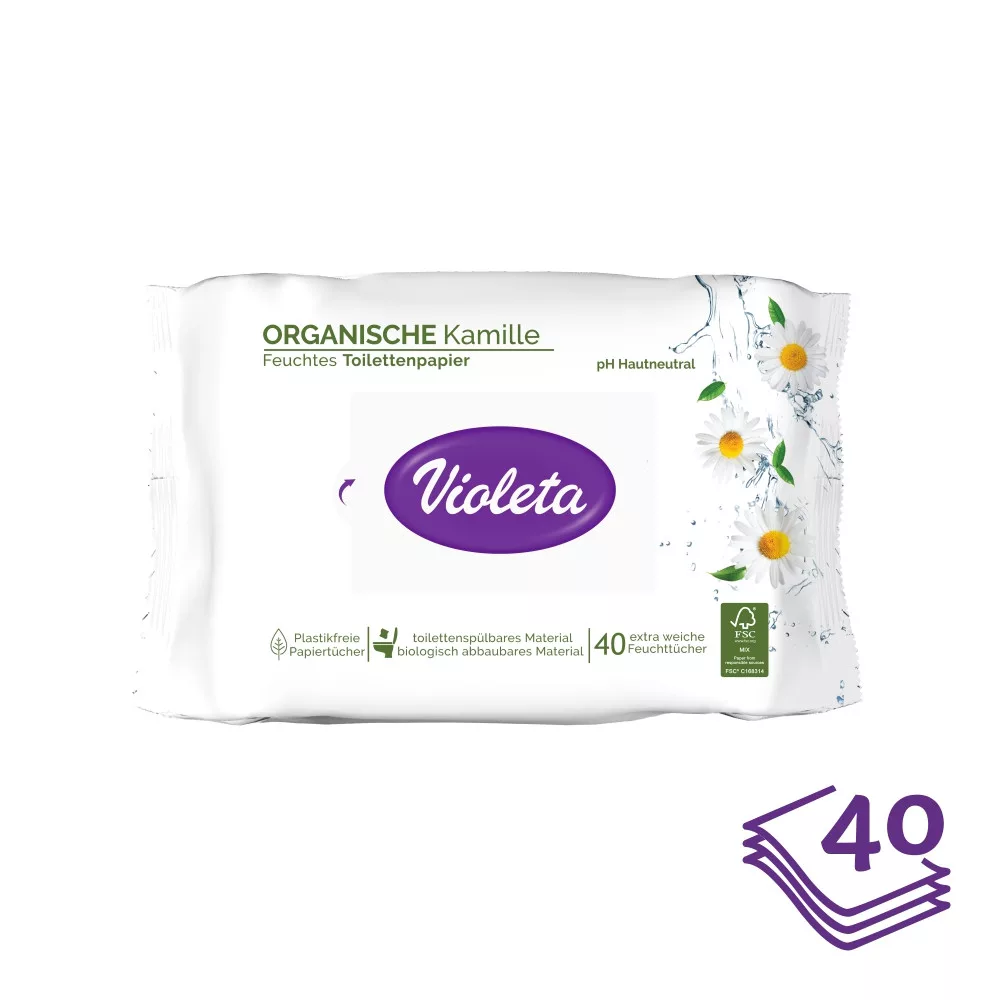 A Violeta kamillás 40 darabos nedves toalettpapírt a család legérzékenyebb bőrű tagjainak ajánljuk. Biológiailag lebomló anyagból készült, lehúzható a toaletten. Organikus kamilla kivonattal. A táskában is könnyedén elfér, bárhová magával viheti.
