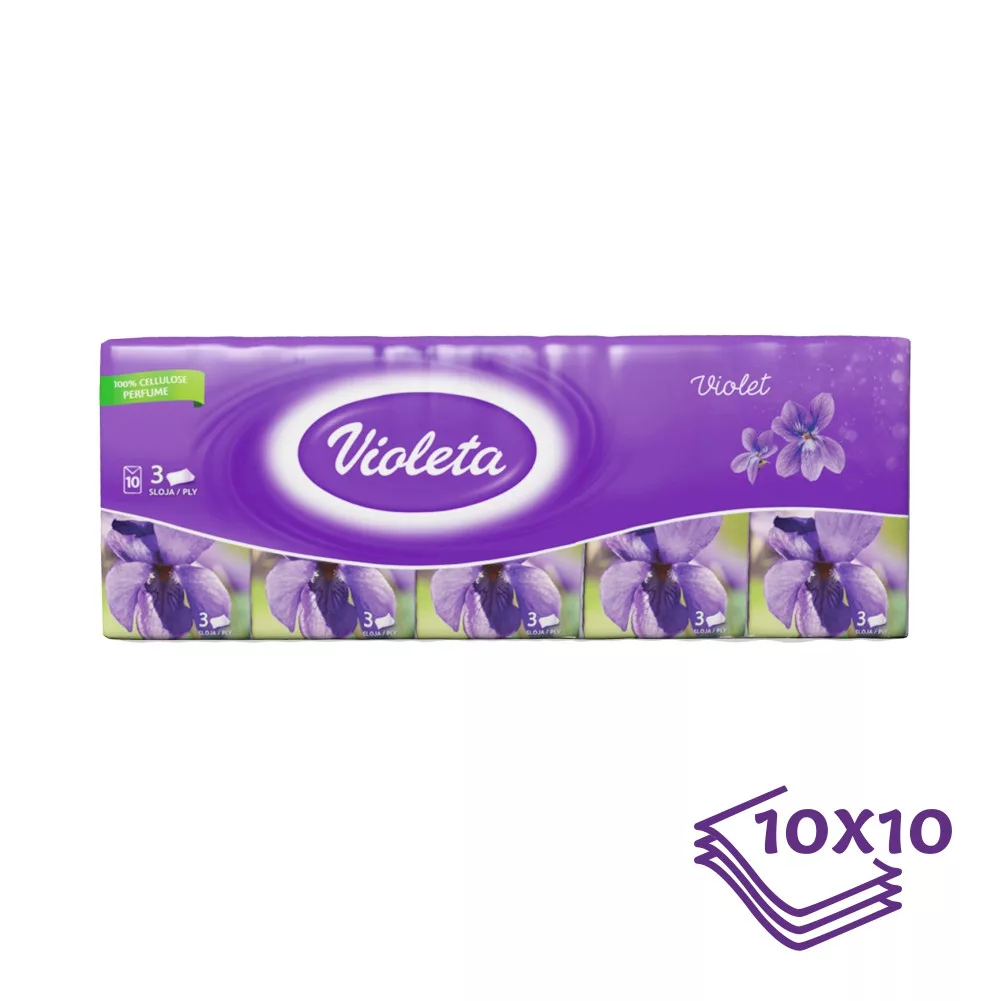 Puhaság és prémium minőség a két legismertebb jellemzője a Violeta 3 rétegű, az ibolya nyugtató és kellemes illatjegyeit viselő, 10×10 db-os papírzsebkendőjének, mely 100%-ban cellulózból készült és bőrgyógyászok által is hitelesített.