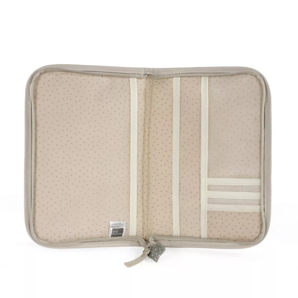- Rendszerezett tárolás: több rekesz és zseb a baba fontos dokumentumaihoz (pl. oltási kiskönyv, születési anyakönyvi kivonat, receptek).